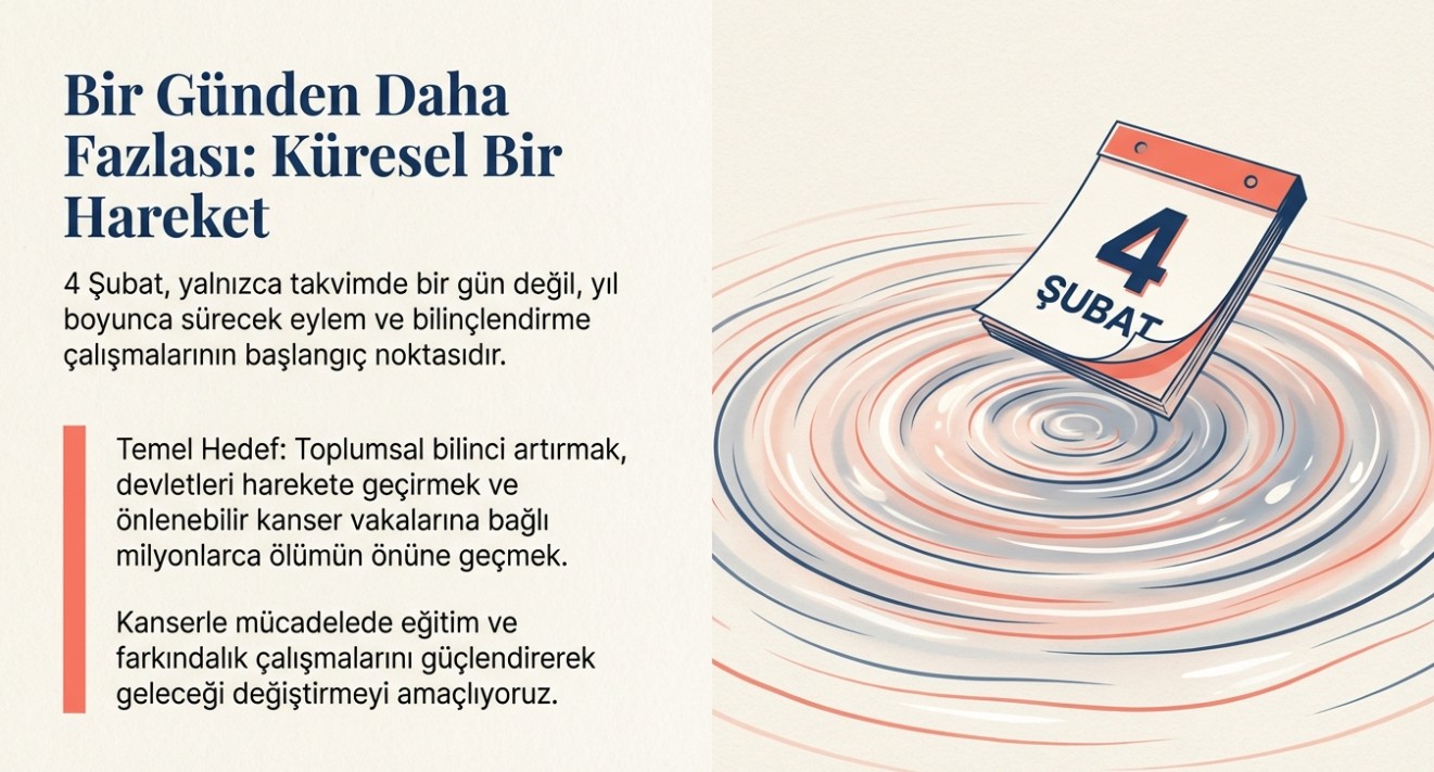 Her yıl 4 Şubat'ta anılan Dünya Kanser Günü, kanser konusunda toplumsal bilinci artırmayı, hastalıkla mücadelede eğitim ve farkındalık çalışmalarını güçlendirmeyi ve hem bireyleri hem de devletleri harekete geçirmeyi amaçlayan küresel bir farkındalık günüdür.