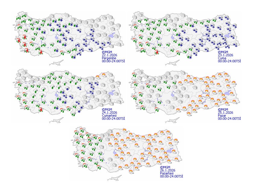 Meteoroloji Genel Müdürlüğü'nün son tahminlerine göre yurt genelinde etkili olması beklenen yağışlı hava nedeniyle vatandaşların dikkatli olması istendi. Birçok bölgede sağanak, gök gürültülü sağanak ve kar yağışı beklenirken; özellikle Ege, Akdeniz ve Güneydoğu Anadolu'da yer yer kuvvetli yağış öngörülüyor. MGM, olası sel, su baskını, kuvvetli rüzgar ve buzlanma risklerine karşı 15 il için sarı kodlu uyarı yayımladı.