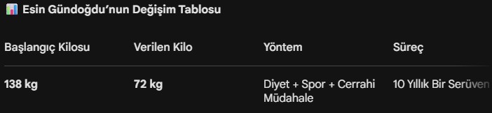 Kilo verme yolculuğunda yaşadığı zorlukları dürüstlükle paylaşan Esin Gündoğdu, bir dönem yeniden kilo aldığını ve sonrasında tıbbi müdahaleye başvurduğunu itiraf etti: