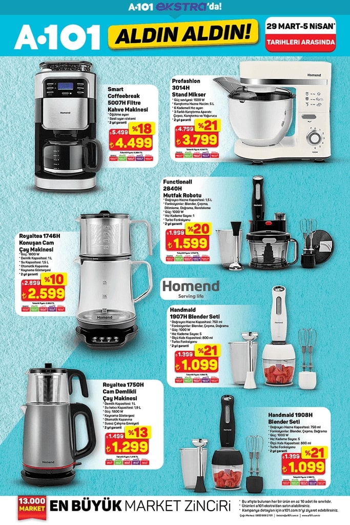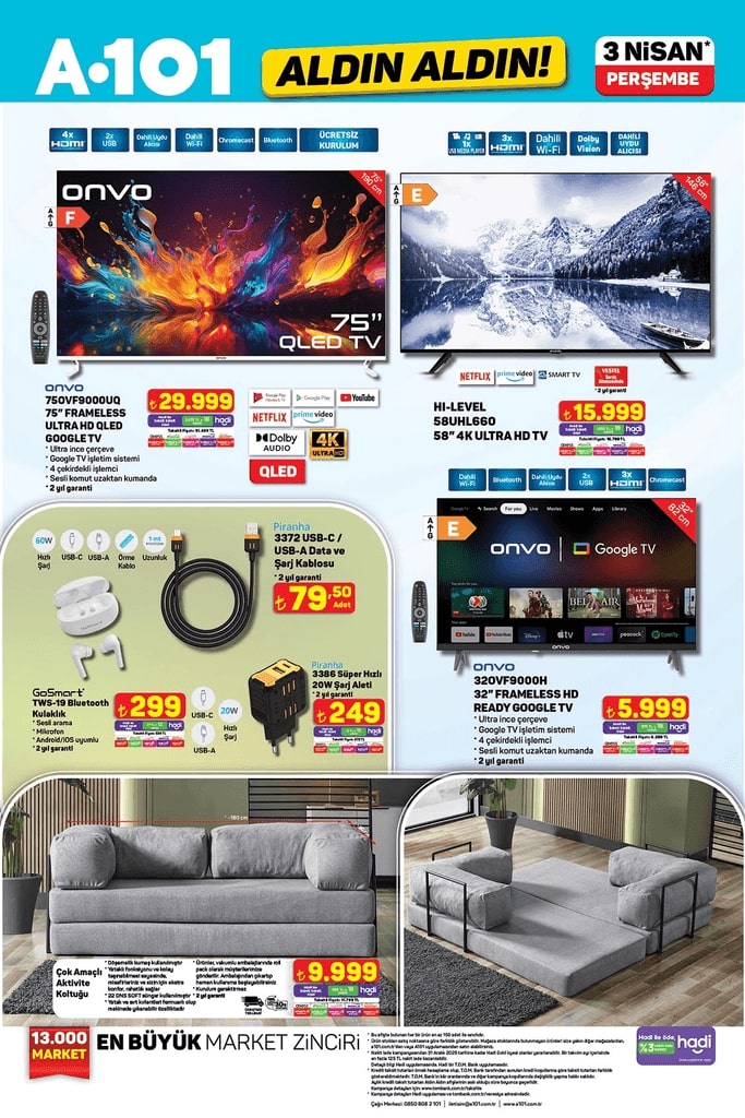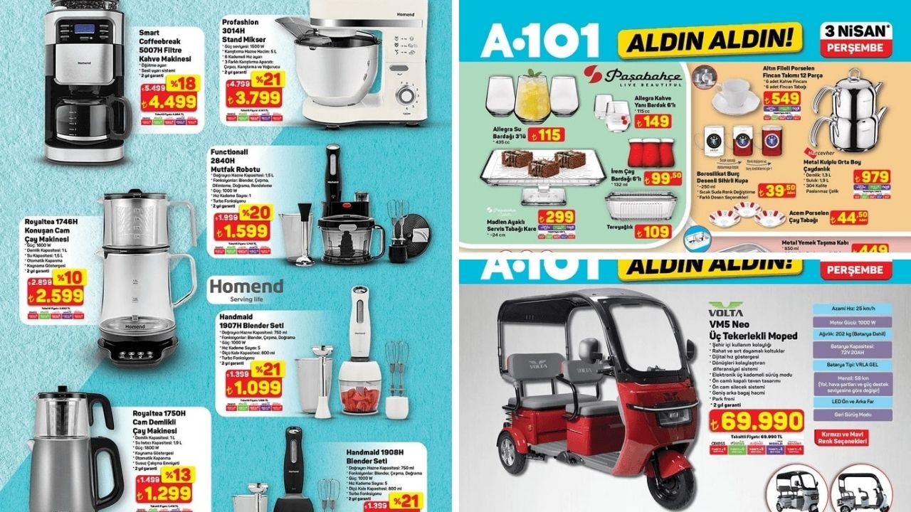 A101 27 Mart - 4 Nisan tarihleri arasında geçerli olacak yeni aktüel ürünler kataloğunu yayımladı. Bu hafta temel gıda ve temizlik ürünlerinden elektronik eşyalara kadar geniş bir yelpazede indirimler dikkat çekiyor. Nisan ayının ilk Aldın Aldın kataloğunda Volta VM5 Neo üç tekerlekli moped, Onvo 75 inç Frameless Ultra HD QLED TV, beyaz eşyalar ve çeşitli mutfak gereçleri de yer alıyor. İşte A101'in yeni haftaya özel fırsatları…