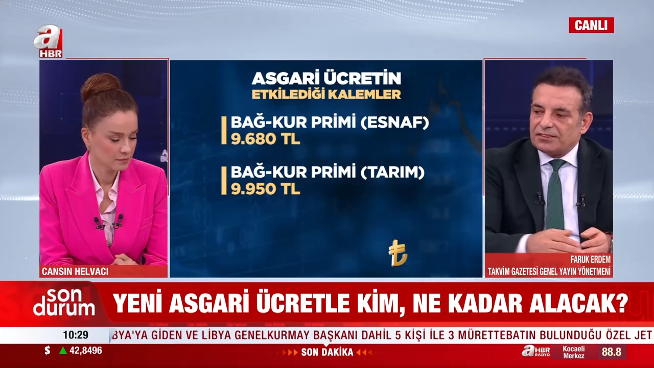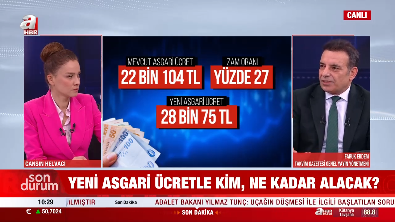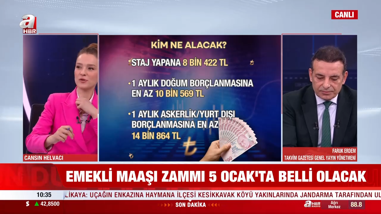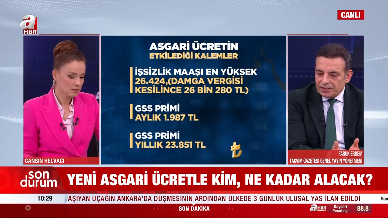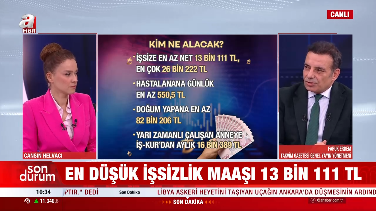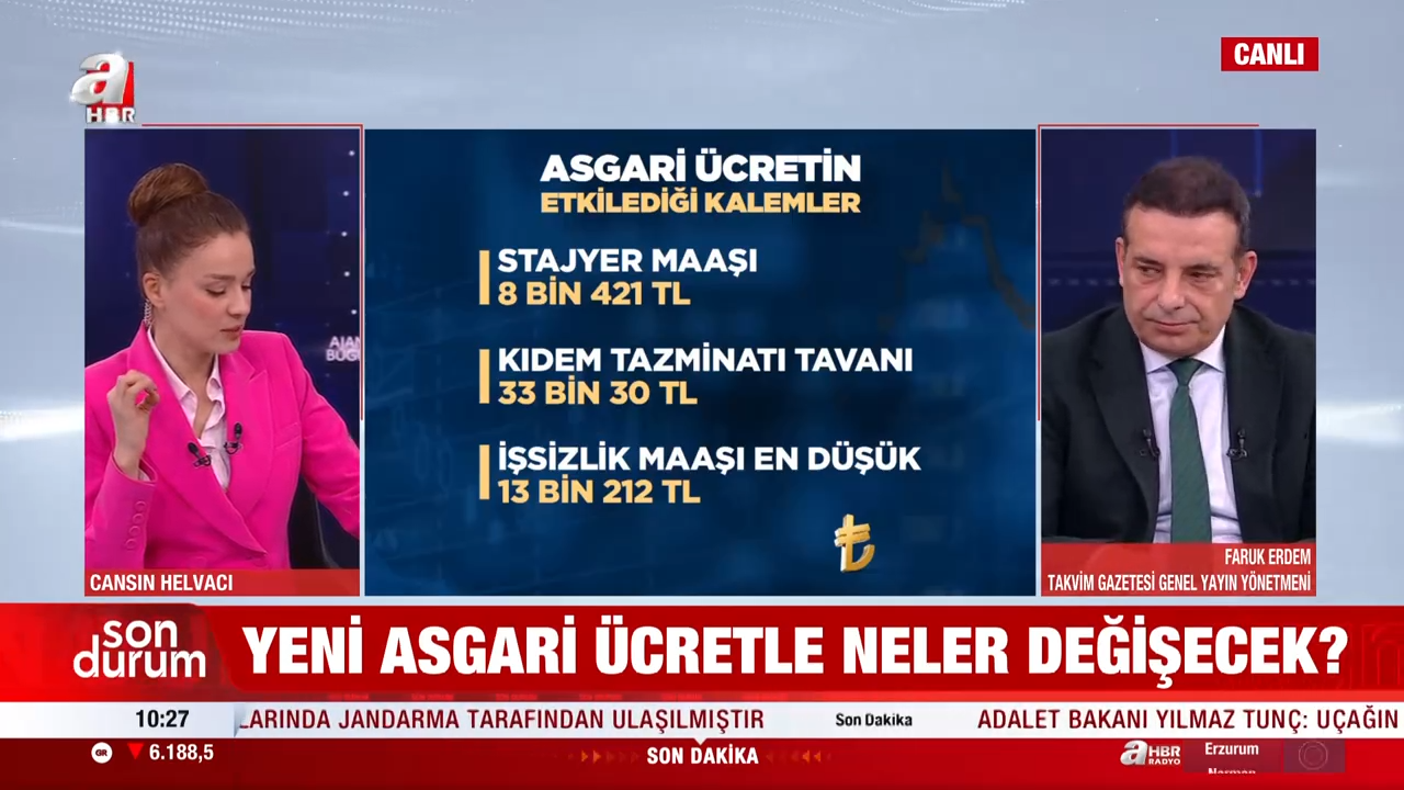 Takvim Gazetesi Genel Yayın Yönetmeni Faruk Erdem, asgari ücret artışının ardından değişen tüm kalemleri A Haber canlı yayınında detaylarıyla anlattı. Yapılan düzenlemenin yalnızca maaşları değil, birçok sosyal ödeme ve prim tutarını da doğrudan etkilediğine dikkat çekti.