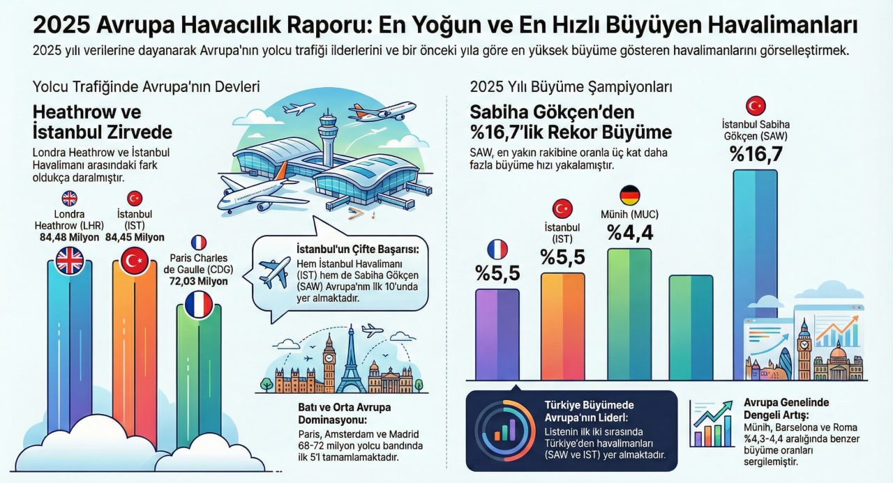 ACI Europe'un 2025 verilerine göre Londra Heathrow 84,48 milyon yolcuyla Avrupa'nın en yoğun havalimanı oldu. İstanbul Havalimanı 84,45 milyonla ikinci sırada yer aldı. Yolcu artışında ise yüzde 16,7 ile Sabiha Gökçen ilk sıraya çıktı.