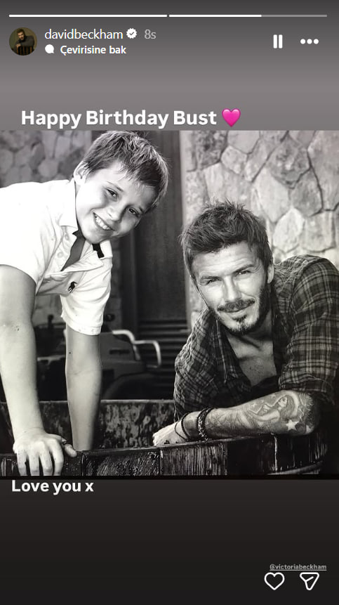 David Beckham, sosyal medya hesabında oğlunun çocukluk yıllarına ait bir fotoğraf paylaştı. Ünlü futbolcu paylaşımına "Bugün 27 yaşında. Doğum günün kutlu olsun Bust. Seni seviyoruz" notunu ekledi. Paylaşımında eşi Victoria Beckham'ı da etiketledi.