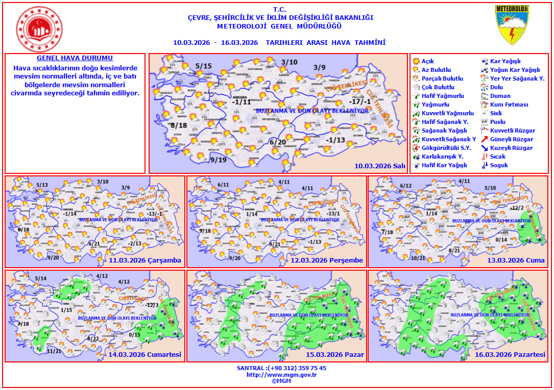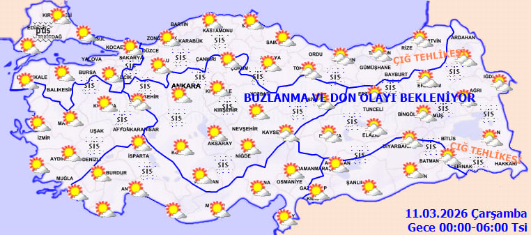 Hava sıcaklıklarının düşük seyrettiği kuzey, iç ve doğu kesimlerde buzlanma ve don olaylarının görülmesi bekleniyor. Özellikle gece ve sabah saatlerinde pus ve yer yer sis etkili olabilir. Bu nedenle sürücülerin görüş mesafesinin azalmasına karşı dikkatli olmaları isteniyor.