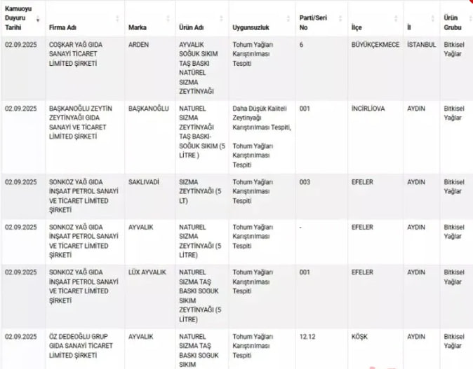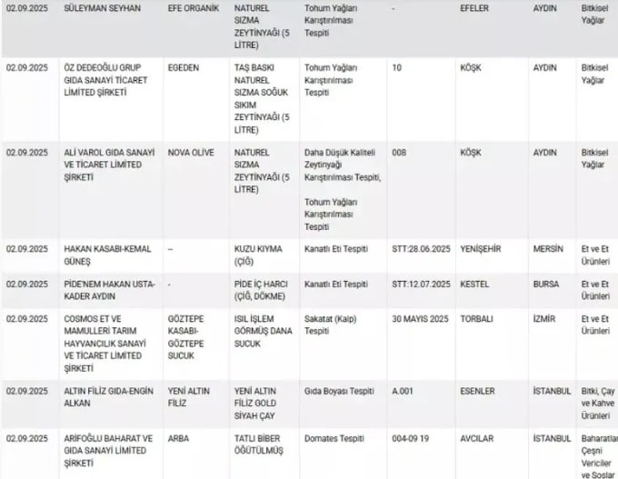 Tarım ve Orman Bakanlığı tarafından 02 Eylül 2025 tarihli taklit ve tağşiş ürünleri listeyi yayımlandı. Çeşitli firmalara ait ürünlerde önemli uygunsuzluklar tespit edildiği bildirilirken bu firmaların isimleri ve ürünleri tek tek duyuruldu. Yapılan incelemelerde gıda boyası katılmış çaylar, içerisinde tohum yağı bulunan zeytinyağları ve sakatat tespit edilen etler ortaya çıktı. İşte Bakanlığın yayınladığı taklit ve tağşiş listesi...