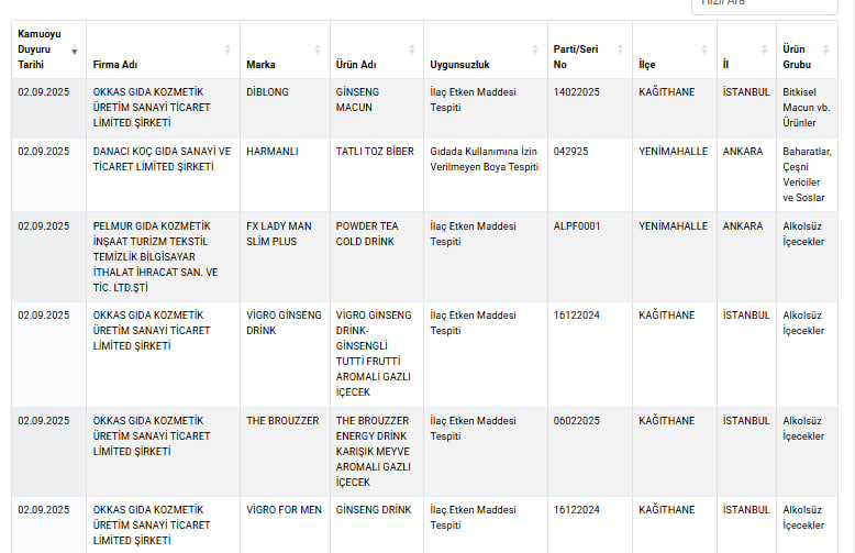Bakanlık yayınladığı sağlığı tehlikeye düşüren ürünler listesine göre sağlık ürünleri satan firmaların ürünlerinde ilaç etken maddesi kullanıldığı tespit edildi.