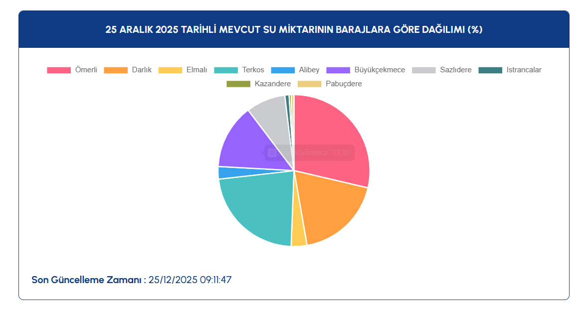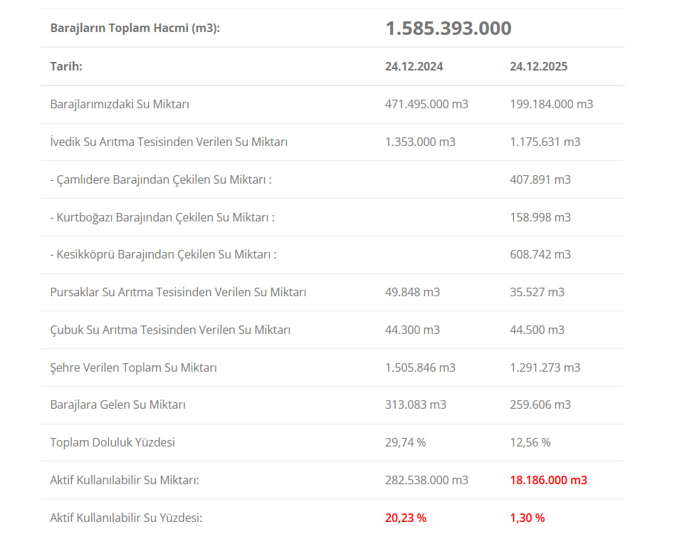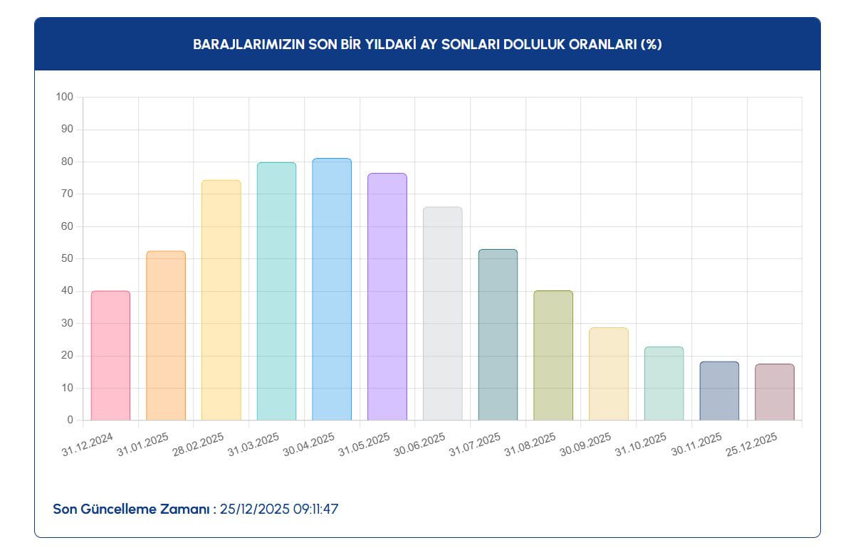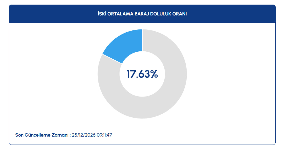 İSKİ'nin paylaştığı güncel verilere göre, 25 Aralık 2025 itibarıyla İstanbul'daki barajların ortalama doluluk oranı yüzde 17,63 olarak kaydedildi.
