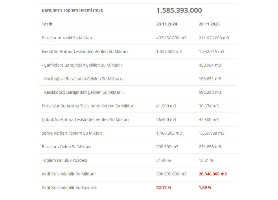 ASKİ'nin 28 Kasım tarihli son raporuna göre, Ankara'daki barajların toplam doluluk oranı yüzde 13,31 olarak ölçüldü. Kullanılabilir aktif su miktarı ise yüzde 1,89 seviyesinde kaydedildi.