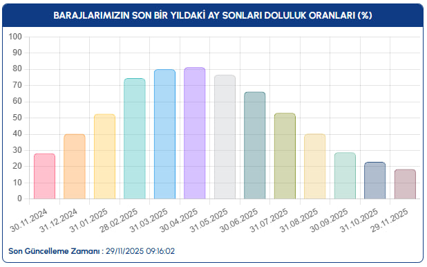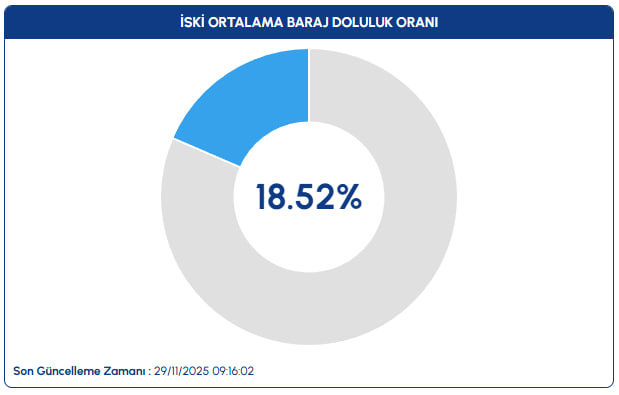 İSKİ tarafından yayımlanan son verilere göre, 29 Kasım 2025 tarihi itibarıyla İstanbul'daki barajların toplam doluluk oranı yüzde 18,52 olarak kaydedildi.