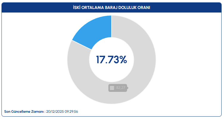 İSKİ tarafından paylaşılan son verilere göre, 20 Aralık 2025 tarihi itibarıyla İstanbul genelindeki barajların ortalama doluluk oranı yüzde 17,73 olarak ölçüldü.