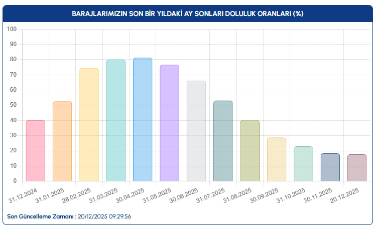 Yıl içindeki verilere bakıldığında baraj seviyelerinde belirgin değişimler yaşandığı görülüyor. Aylık raporlar, İstanbul barajlarının en yüksek doluluk oranına nisan ayında yüzde 81,23 ile ulaştığını, aralık ayına gelindiğinde ise bu oranın yüzde 17,73 seviyesine kadar gerilediğini ortaya koydu.