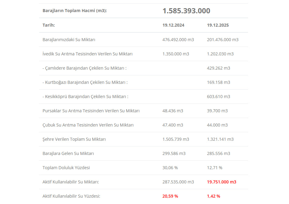 ASKİ tarafından 19 Aralık tarihinde paylaşılan güncel verilere göre, Ankara'daki barajların toplam doluluk oranı yüzde 12,71 olarak kayıtlara geçti. Kent genelinde kullanılabilir aktif su miktarının ise yüzde 1,42 seviyesinde olduğu bildirildi.