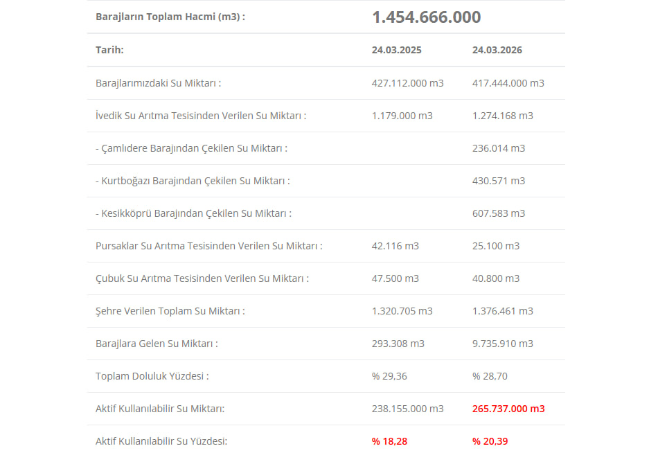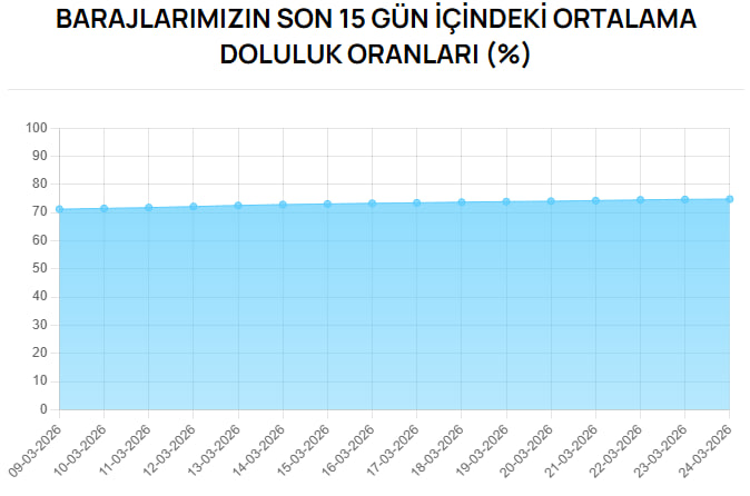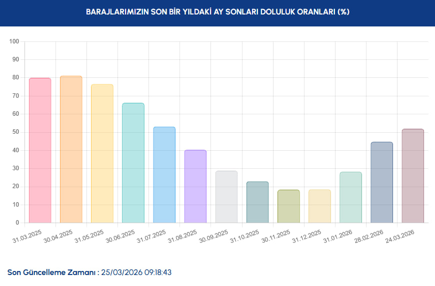 Mart 2025'te doluluk yaklaşık %80 seviyesindeydi. 2025 sonbaharında en düşük seviye ise Kasım ayında yüzde 18,38 olarak görüldü. 2026 Mart itibarıyla toparlanma var ancak bu artış sınırlı kaldı. Mart 2026 itibarıyla baraj doluluk oranları yüzde 51,93 olarak kayıtlara geçti.