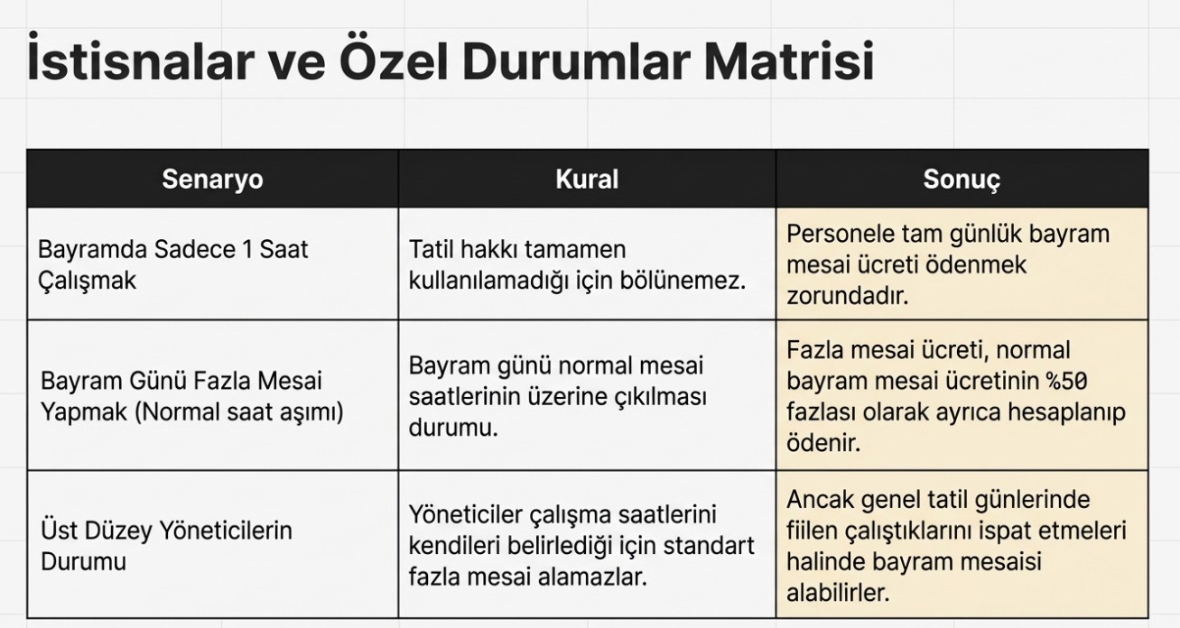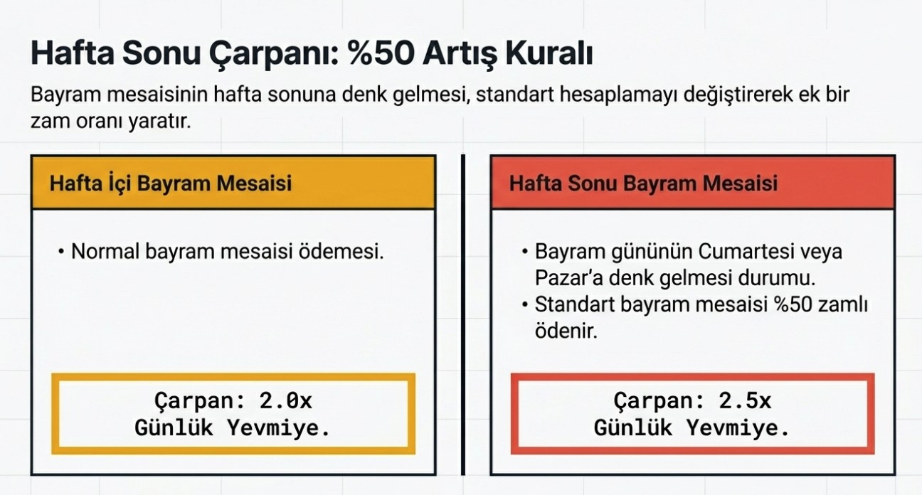 Bayram günlerinin hafta sonuna denk gelmesi halinde mesai ücreti daha yüksek hesaplanıyor. Normalde bayram günlerinde iki yevmiye üzerinden ödeme yapılırken, hafta sonuna denk gelen günlerde bu ücret yüzde 50 artırılarak 2,5 kat olarak uygulanıyor.