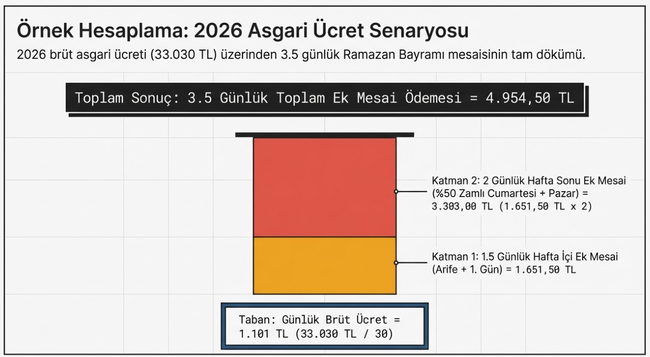 Bayram mesaisi uygulamasına göre bir gün çalışan asgari ücretli, normal yevmiyesine ek olarak 1.101 TL bayram mesai ücreti alıyor. Ramazan Bayramı'nda arife günü de dahil edildiğinde toplam 3,5 günlük resmi tatil bulunuyor. Bu süre boyunca çalışan bir personelin, maaşına ek olarak yaklaşık 3 bin 853 TL ek ödeme alması mümkün oluyor.