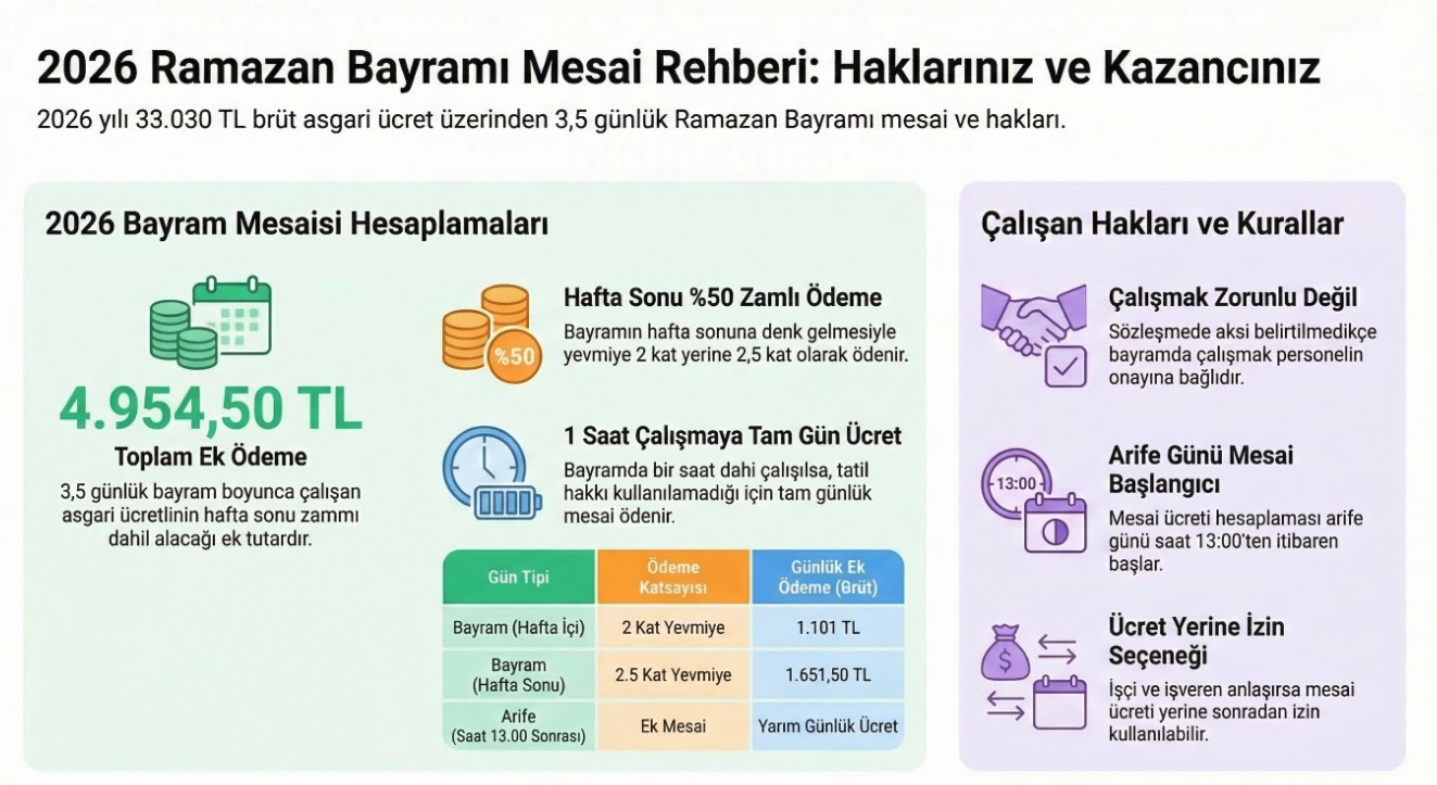 Ramazan Bayramı yaklaşırken bayram günlerinde çalışacak milyonlarca çalışan için mesai ücretleri ve haklar yeniden gündeme geldi. Mevzuata göre bayramda çalışan işçilere normal yevmiyelerinin yanı sıra ek ödeme yapılırken, hafta sonuna denk gelen günlerde bu ücret daha da artıyor.