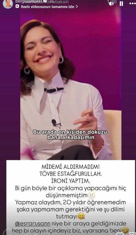 "Midemi aldırmadım! tövbe estağfurullah. ironi yaptım. Bir gün böyle bir açıklama yapacağımı hiç düşünmemiştim. Yapmaz olaydım, 20 yıldır öğrenemedim şaka yapmamam gerektiğini ve şu dilimi tutmayı!"