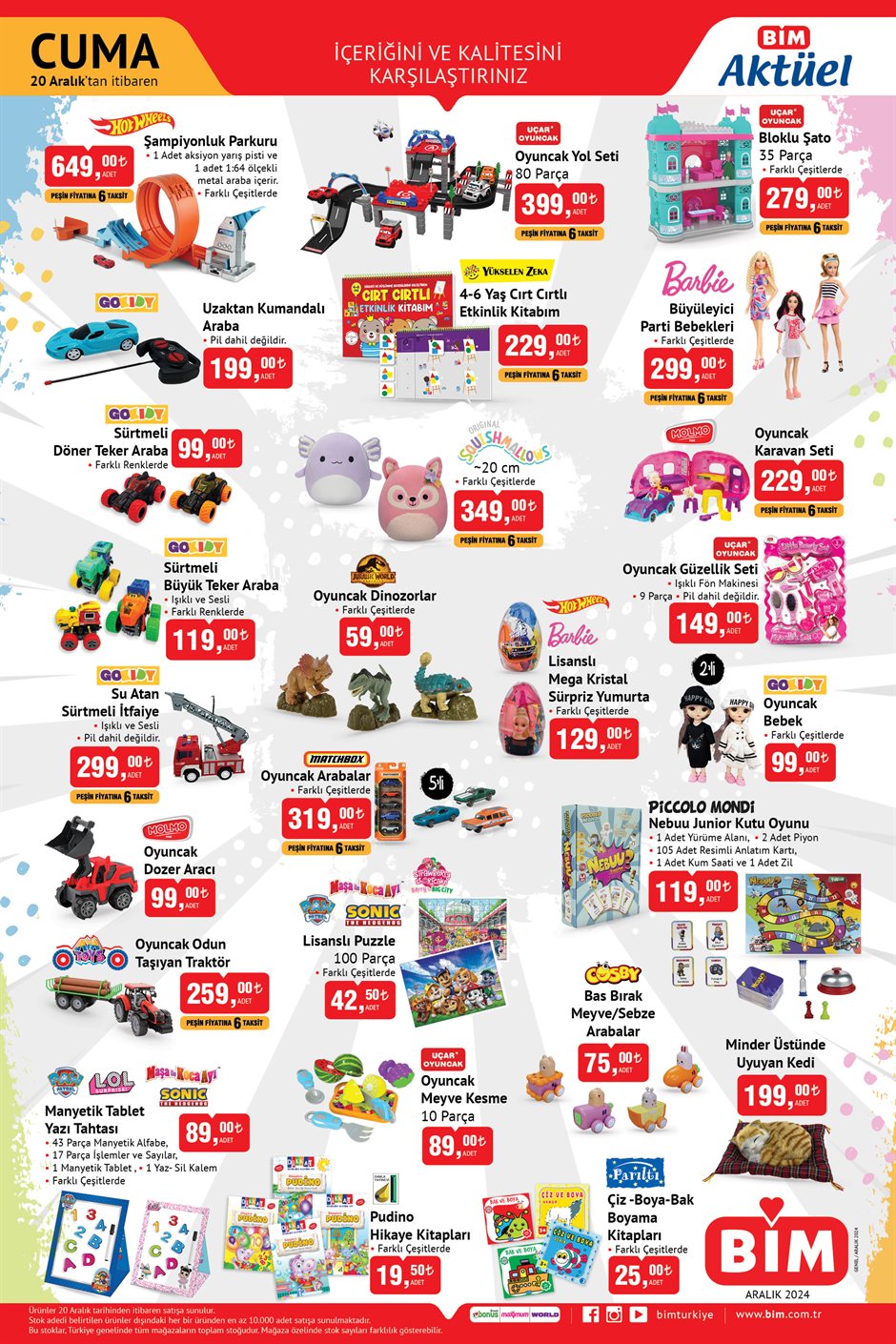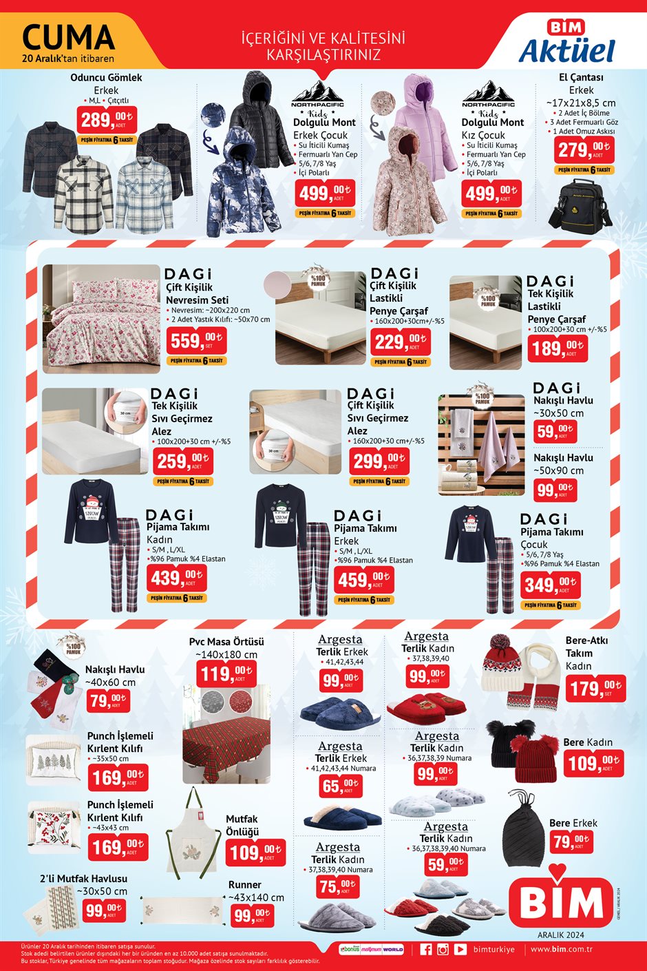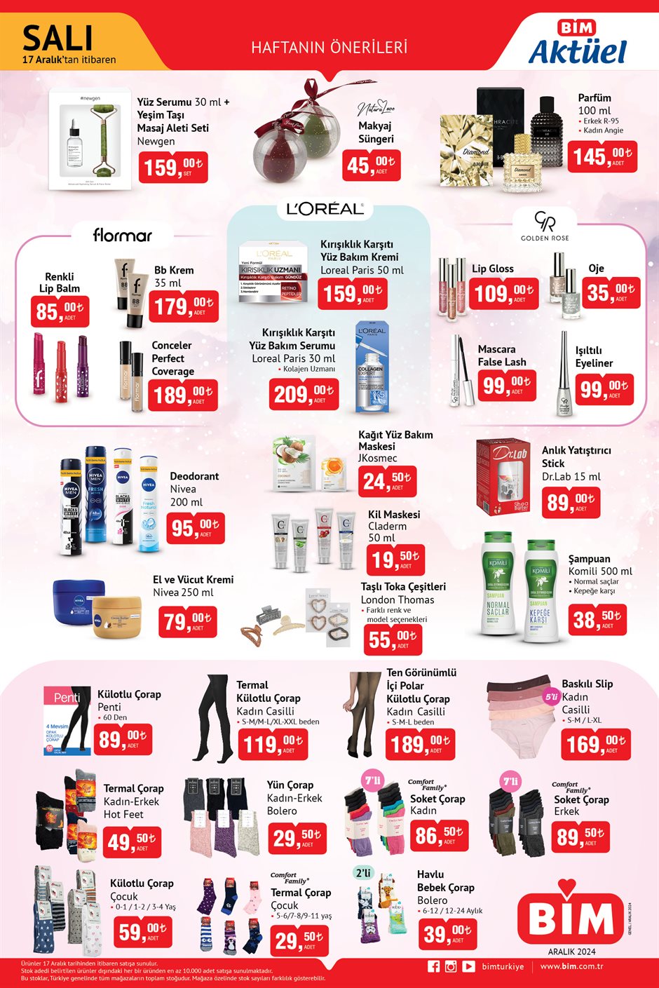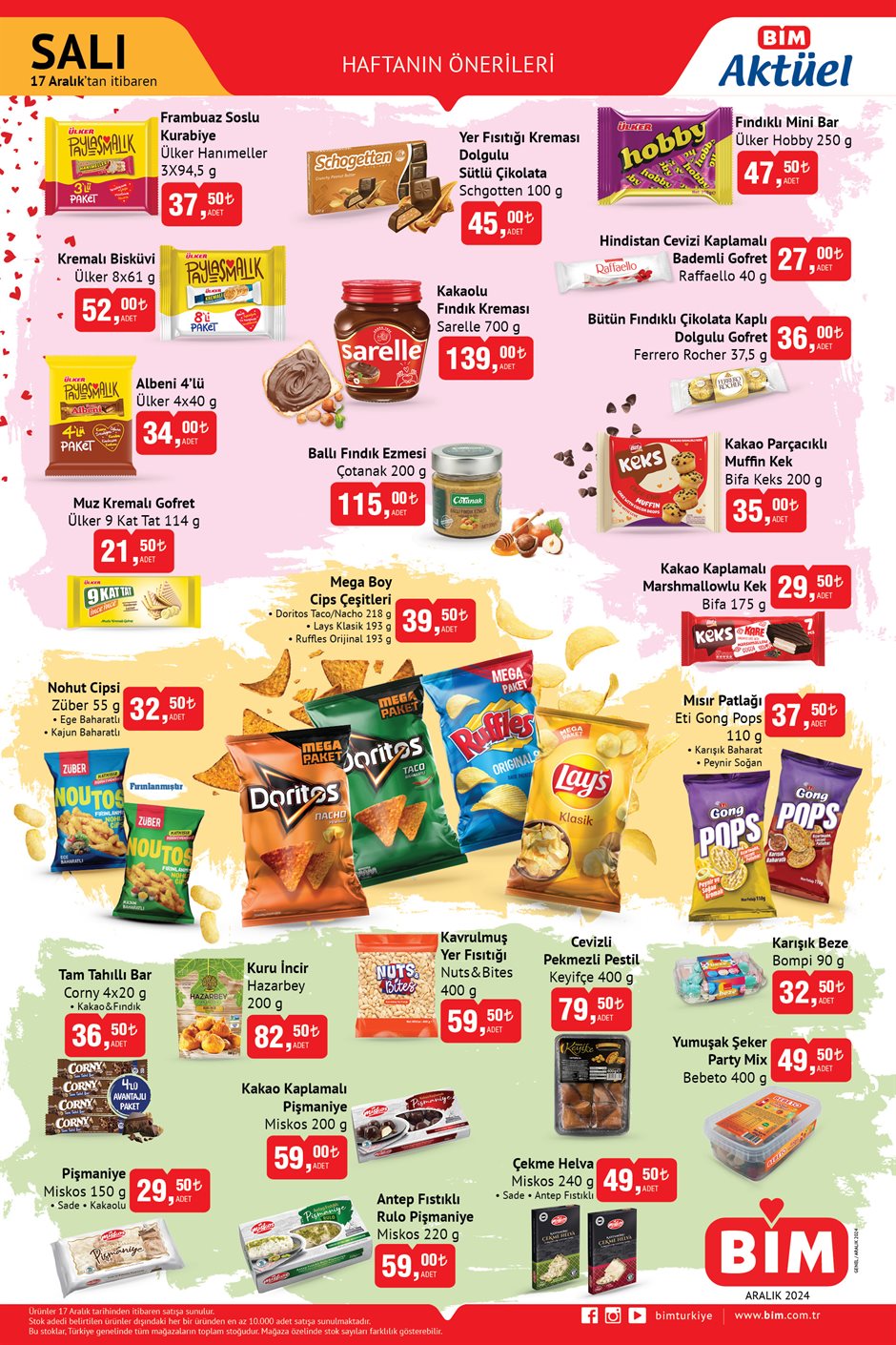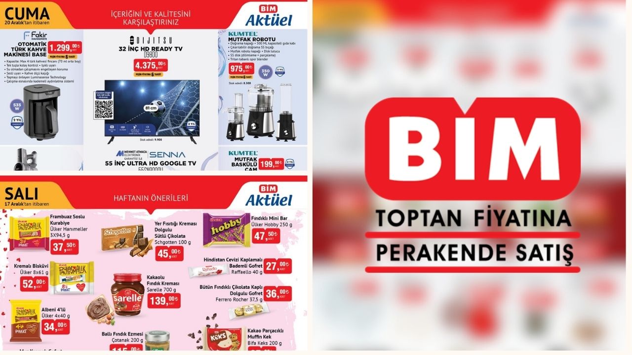 BİM, 17-20 Aralık tarihleri için yeni aktüel kataloglarını yayımladı. 17 Aralık Salı günü raflarda yer alacak ürünler arasında atıştırmalıklar, süt ve süt ürünleri, piliç ve donuk ürünler, makyaj malzemeleri ile kadın ve erkek çorap çeşitleri bulunuyor. 20 Aralık Cuma günü ise Wag Maşası, Senna TV, otomatik Türk kahvesi makinesi, Heifer Pro şarjlı kablosuz süpürge, Senna 55 inç TV, saç düzleştirici ve şekillendirici gibi ürünler satışa sunulacak.