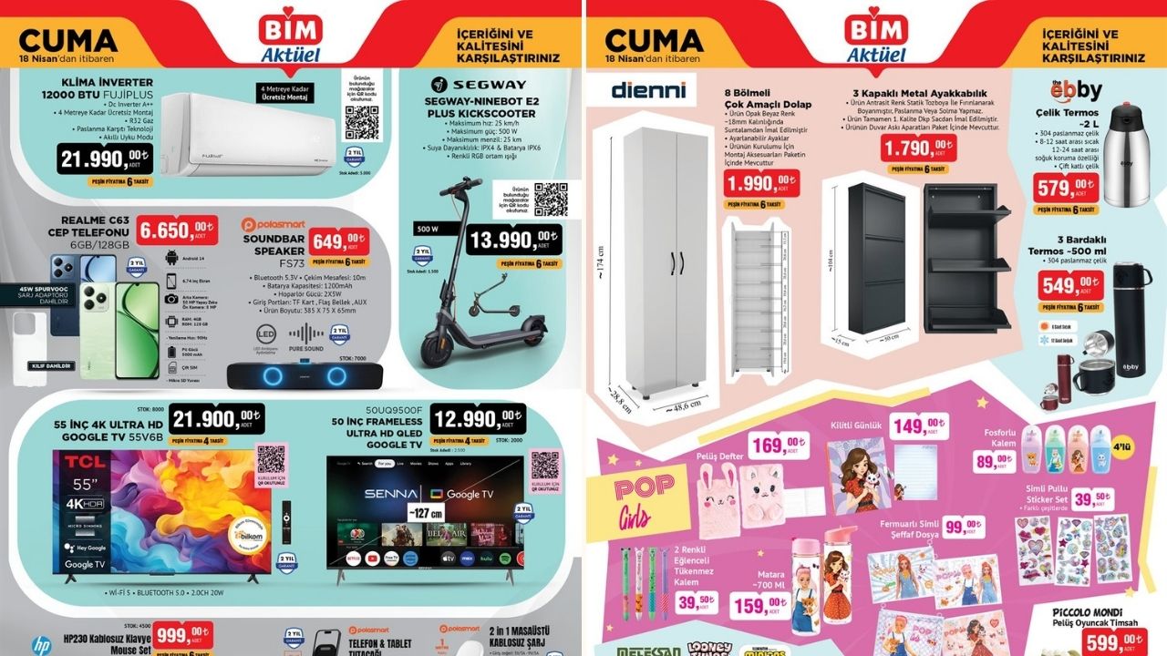 BİM mağazalarında her hafta cuma günleri yayımlanan aktüel kataloglar, bu hafta da pek çok fırsatla alışveriş severlerin karşısına çıkıyor. 18 Nisan Cuma günü raflardaki yerini alacak ürünler arasında evlerin vazgeçilmezi olacak pek çok teknoloji ve ev gereci bulunuyor. Fujiplus Inverter Klima, Segway Kickscooter, Elektrikli Düdüklü Tencere ve Mini Fırın gibi dikkat çekici ürünler, uygun fiyatlarla satışa sunulacak. İşte 18 Nisan Cuma günü BİM aktüel kataloglarında yer alan ürünlerin tam listesi...