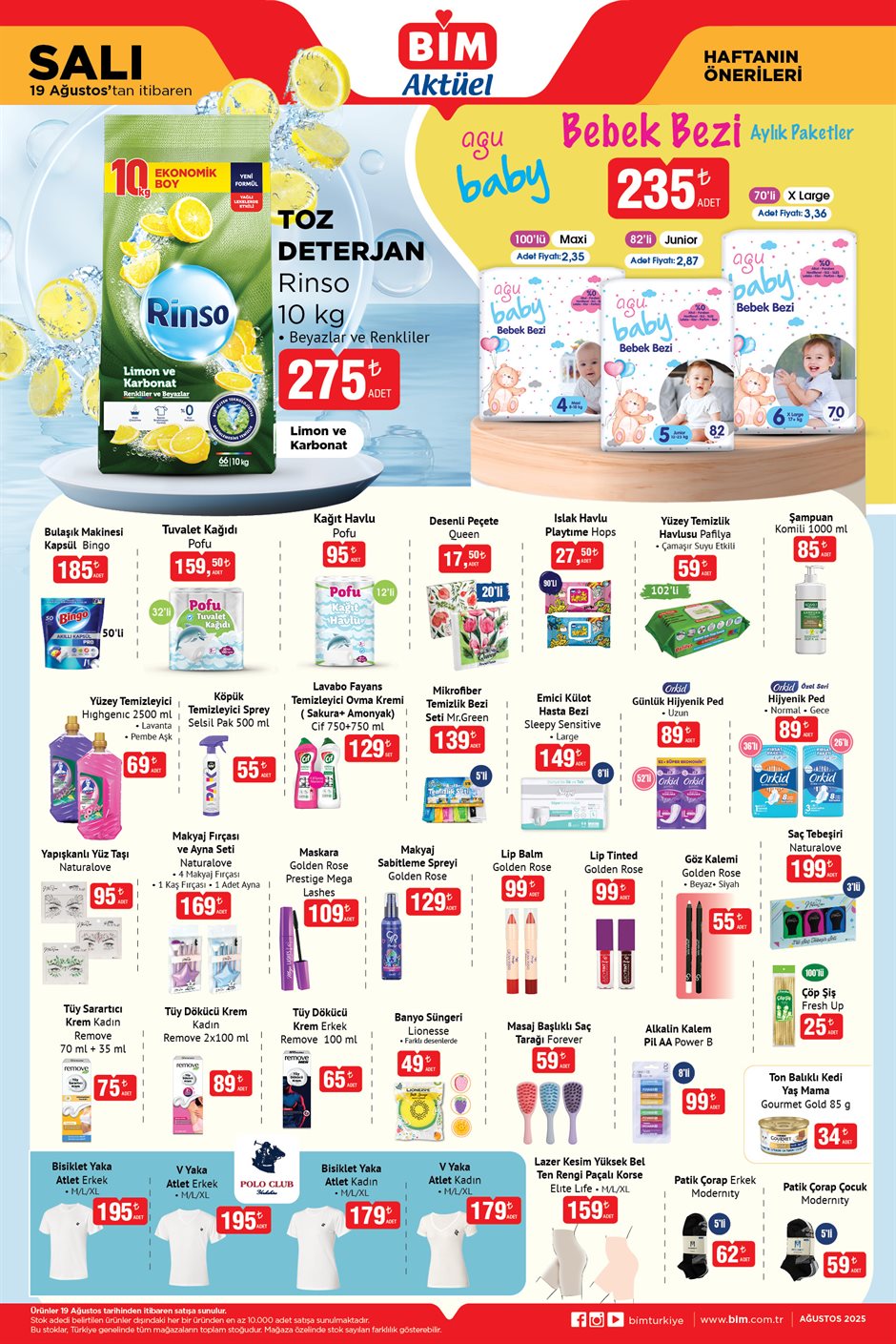 Türkiye'nin en çok tercih edilen zincir marketlerinden BİM, yeni aktüel kataloğu ile müşterilerine cazip fırsatlar sunuyor. 19 Ağustos Salı'dan itibaren geçerli olacak indirimlerde hem temel gıda ürünleri hem de temizlik, kişisel bakım ve tekstil ürünleri öne çıkıyor. Toz deterjan 10 kg 275 TL, bulaşık makinesi kapsülü 50'li 185 TL, 12'li kağıt havlu 95 TL ve 24'lü tuvalet kağıdı 159,50 TL'den satışa çıkacak. İşte bu haftanın dikkat çeken indirimleri…