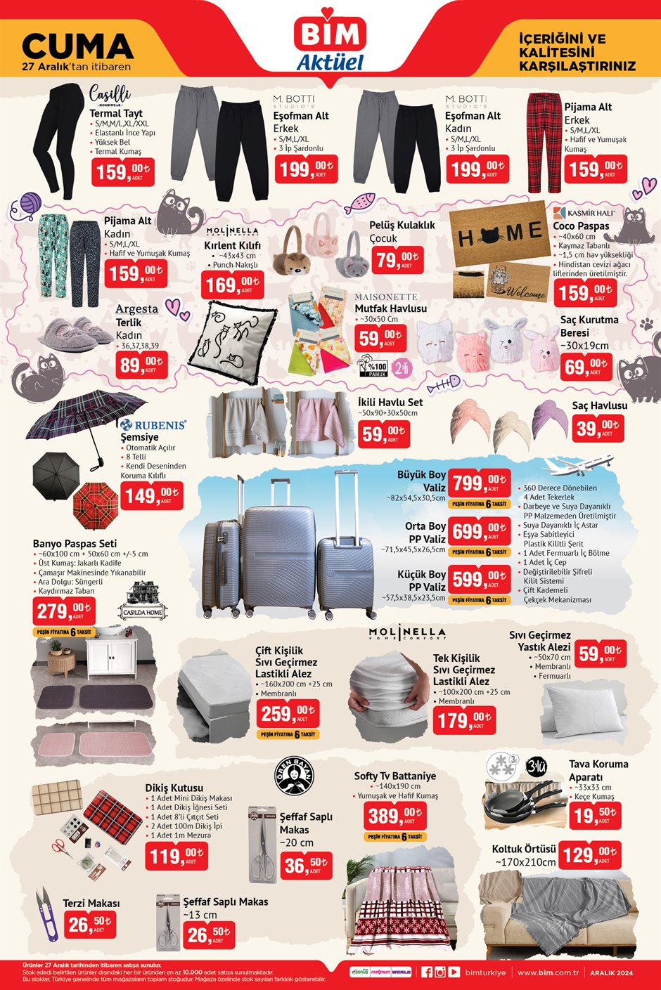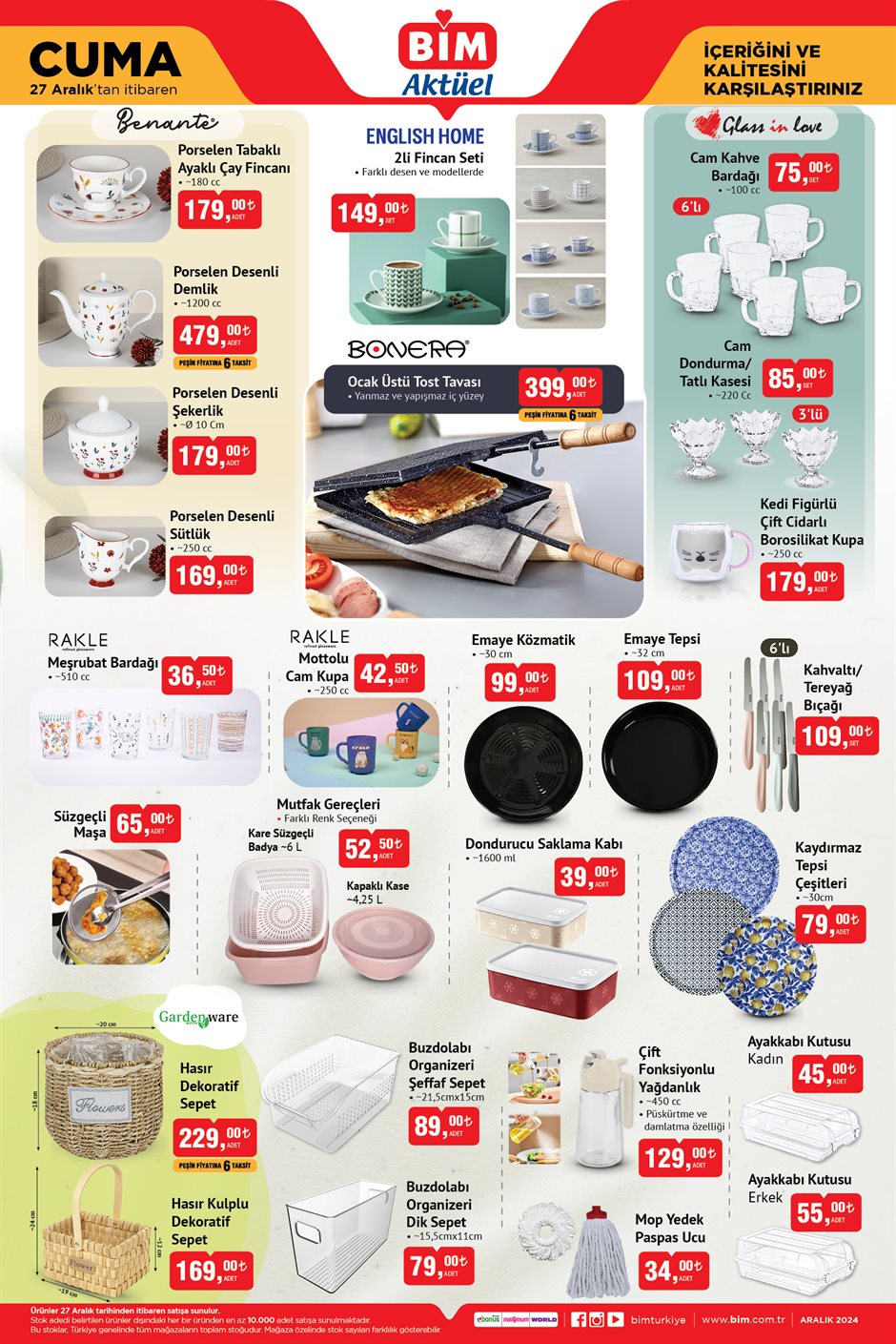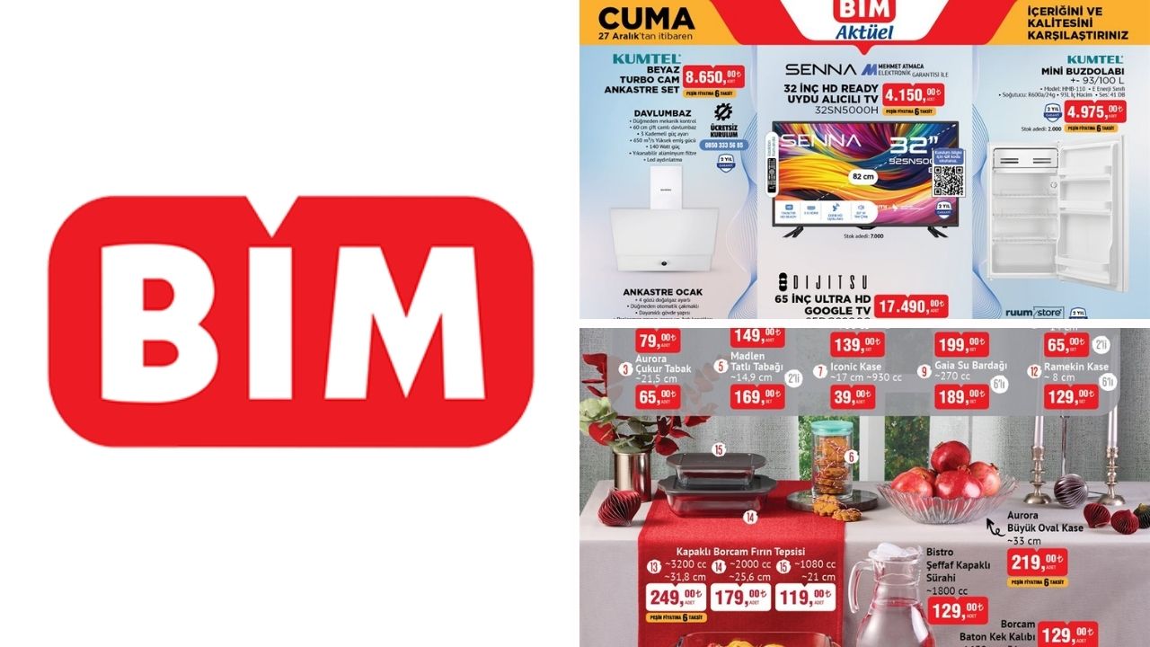 BİM, 24-27 Aralık tarihlerini kapsayan yeni aktüel ürünler kataloğunu müşterileriyle buluşturdu. Her hafta Salı ve Cuma günleri uygun fiyatlı ürün seçenekleri sunan zincir market, bu hafta közmatik, çay setleri, ankastre seti, bavul çeşitleri ve çocuklar için pelüş kulaklıklar gibi dikkat çeken ürünlerle öne çıkıyor. Ayrıca temel gıda ürünleri ve deterjanlarda da önemli indirimler yer alıyor.