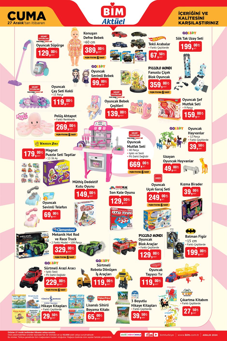 BİM mağazalarında her hafta geniş bir ürün yelpazesiyle indirimli fırsatlar sunuluyor. Bu haftaki aktüel katalogda, temel gıda ürünlerinin yanı sıra oyuncaklar, mutfak gereçleri ve yılbaşı temalı dekorasyon ürünleri öne çıkıyor. 24-27 Aralık tarihleri arasında geçerli olan bu indirimler, alışveriş yapmak isteyenler için cazip fırsatlar sunuyor. İşte BİM aktüel 24-27 Aralık indirimleri ve fırsatlarla dolu ürün listesi...