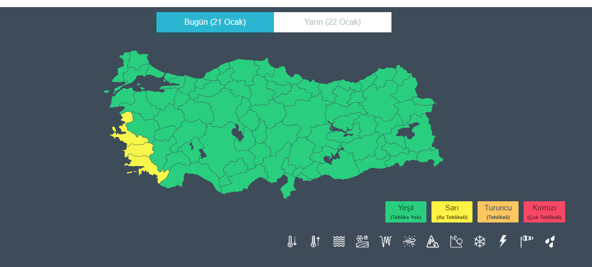 Meteoroloji Genel Müdürlüğü, kuvvetli rüzgar ve fırtına nedeniyle Ege ve Akdeniz'de alarm verdi. Aydın, İzmir ve Muğla için sarı kodlu uyarı yayımlanırken, Kuzey Ege, Güney Ege, Batı Akdeniz ve Doğu Akdeniz genelinde rüzgarın yer yer fırtına ve kuvvetli fırtına şeklinde etkili olmasının beklendiği bildirildi.