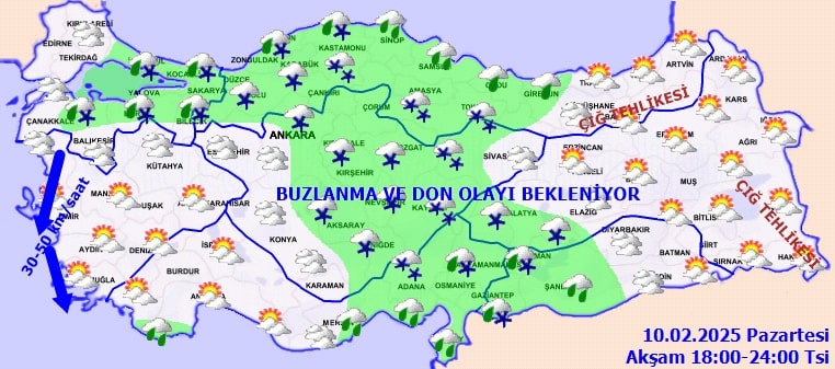 Marmara'nın doğusu, İç Anadolu'nun büyük kısmı, Karadeniz'in kıyı kesimleri, Doğu ve Güneydoğu Anadolu'nun batısı ile bazı Ege ve Akdeniz bölgelerinde yağış bekleniyor. Yağışlar kıyı kesimlerde yağmur, iç ve yüksek bölgelerde ise karla karışık yağmur ve kar şeklinde görülecek. İç ve doğu kesimlerde buzlanma ve don olayına bağlı olarak pus ve yer yer sis etkili olabilir. Ayrıca, Doğu Karadeniz ve Doğu Anadolu'nun yüksek kesimlerinde çığ riski bulunuyor.