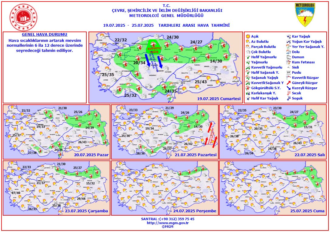Meteoroloji Genel Müdürlüğü'nün 19 - 25 Temmuz 2025 tarihlerini kapsayan haftalık hava tahmin raporuna göre, Türkiye genelinde hava sıcaklıkları artarak mevsim normallerinin 6 ila 12 derece üzerinde seyredecek. Güneydoğu Anadolu bölgelerinde termometreler 43 derecenin üzerine çıkarken, Ege ve Akdeniz bölgesinde 40 dereceye kadar yükselen sıcaklıklar dikkat çekiyor. Hafta boyunca Karadeniz'in iç kesimleri, Doğu ve İç Anadolu'da yerel gök gürültülü sağanak yağışlar görülecek.