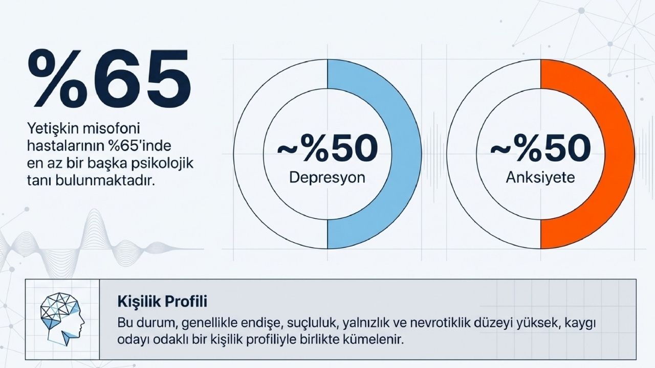 Geniş ölçekli araştırmalar, misofoni yaşayan bireylerin büyük bölümünde en az bir psikiyatrik tanı bulunduğunu gösteriyor. Depresyon ve anksiyete oranı belirgin şekilde yüksek.