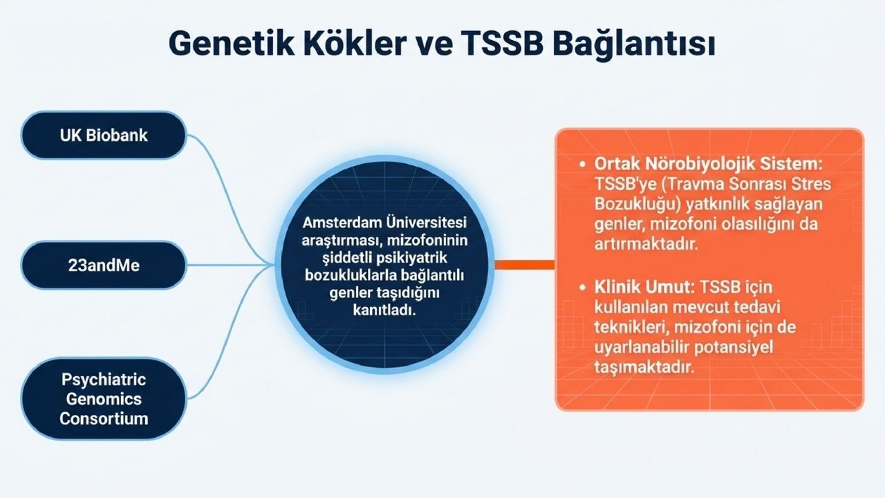 Yoğun ses tepkisinin arkasında genetik bir yatkınlık bulunabileceğine dair bulgular güç kazanıyor. Amsterdam Üniversitesi'nden psikiyatrist Dirk Smit liderliğindeki araştırma ekibi, Psikiyatrik Genomik Konsorsiyumu, İngiltere Biyobankası ve 23andMe verilerini analiz ederek misofoni ile ilişkili genetik izleri inceledi. Çalışma, misofoni yaşayan bireylerin ciddi psikiyatrik bozukluklarla bağlantılı gen varyantlarını taşıma olasılığının belirgin şekilde daha yüksek olduğunu ortaya koydu.
