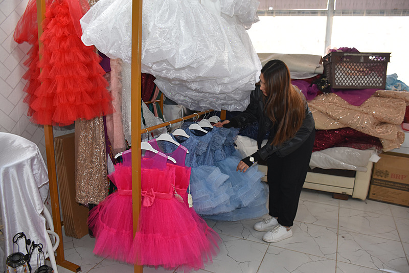 Atölyesinde, 0-14 yaş arasındaki kız çocukları için şık abiyeler üreten Ergün, bu ürünleri internet üzerinden ve mağazasında satışa sunuyor.