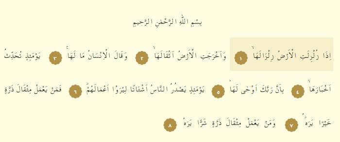 Anlamı: Yer o dehşetli sarsıntısıyla sarsıldığında; (1) Ve yer ağırlıklarını dışarı attığında; (2) Ve insan, "Ne oluyor buna!" dediğinde; (3) O gün yer, bütün haberlerini rabbinin ona vahyettiği şekilde anlatır. (4-5) İşte o gün insanlar yaptıkları kendilerine gösterilsin diye (bulundukları yerden) farklı gruplar halinde çıkarlar. (6) Kim zerre miktarı hayır yapmışsa onu (karşılığını) görür. (7) Kim de zerre miktarı şer işlemişse onu (karşılığını) görür. (8)