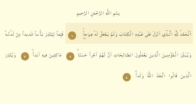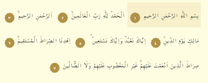 Anlamı: Hamd, Âlemlerin Rabbi, Rahmân, Rahîm, hesap ve ceza gününün (ahiret gününün) maliki Allah'a mahsustur. (2-4) (Allahım!) Yalnız sana ibadet ederiz ve yalnız senden yardım dileriz. (5) Bizi doğru yola, kendilerine nimet verdiklerinin yoluna ilet; gazaba uğrayanlarınkine ve sapıklarınkine değil. (6-7)