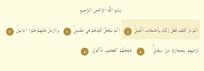 Anlamı: Rabbinin, fil sahiplerine ne yaptığını görmedin mi? (1) Onların tuzaklarını boşa çıkarmadı mı? (2) Üzerlerine balçıktan pişirilmiş taşlar atan sürü sürü kuşlar gönderdi. Nihayet onları yenilmiş ekin yaprakları haline getirdi. (3-5)