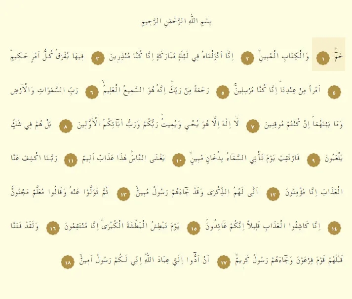 Duhan Suresi Anlamı: Hâ. Mîm. (1) Apaçık olan Kitab'a andolsun ki, biz onu (Kur'an'ı) mübarek bir gecede indirdik. Kuşkusuz biz uyarıcıyızdır. (2-3) Katımızdan bir emirle her hikmetli işe o gecede hükmedilir. Çünkü biz, Rabbinin bir rahmeti olarak peygamberler göndermekteyiz. O işitendir, bilendir. (4-7) Eğer kesin olarak inanıyorsanız (bilin ki Allah), göklerin, yerin ve ikisi arasında bulunanların Rabbidir. (7) O'ndan başka ilâh yoktur. (Her şeyi O) diriltir ve öldürür. Sizin de Rabbiniz, önceki atalarınızın da Rabbidir. (8) Fakat onlar, şüphe içinde eğlenip duruyorlar. (9) Şimdi sen, göğün, insanları bürüyecek açık bir duman çıkaracağı günü gözetle. Bu, elem verici bir azaptır. (10-11) (İşte o zaman insanlar:) Rabbimiz! Bizden azabı kaldır. Doğrusu biz artık inanıyoruz (derler). (12) Nerede onlarda öğüt almak? Oysa kendilerine gerçeği açıklayan bir elçi gelmişti. (13) Sonra ondan yüz çevirdiler ve: Bu, öğretilmiş bir deli! dediler. (14) Biz azabı birazcık kaldıracağız, ama siz yine (eski halinize) döneceksiniz. (15) Fakat biz büyük bir şiddetle yakalayacağımız gün, kesinlikle intikamımızı alırız. (16) Andolsun, kendilerinden önce biz, Firavun'un kavmini de imtihan etmiştik. Onlara: Allah'ın kulları! Bana gelin! Çünkü ben size (gönderilmiş) güvenilir bir resûlüm diye (davette bulunan) şerefli bir elçi gelmişti. (17-18)