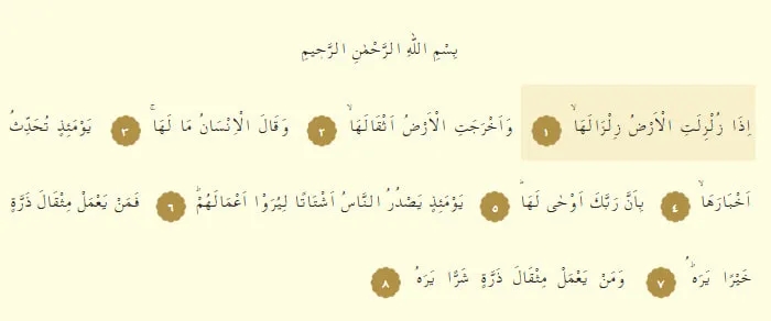 Zilzal Suresi Anlamı: Yer o dehşetli sarsıntısıyla sarsıldığında; (1) Ve yer ağırlıklarını dışarı attığında; (2) Ve insan, "Ne oluyor buna!" dediğinde; (3) O gün yer, bütün haberlerini rabbinin ona vahyettiği şekilde anlatır. (4-5) İşte o gün insanlar yaptıkları kendilerine gösterilsin diye (bulundukları yerden) farklı gruplar halinde çıkarlar. (6) Kim zerre miktarı hayır yapmışsa onu (karşılığını) görür. (7) Kim de zerre miktarı şer işlemişse onu (karşılığını) görür. (8)