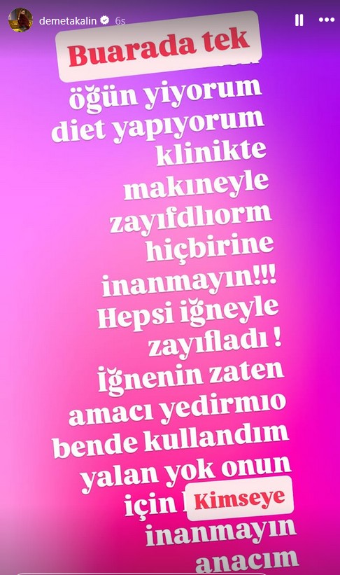 "Tek öğün yiyorum, diyet yapıyorum, klinikte makineyle zayıflıyorum diyenlere inanmayın. Hepsi iğneyle zayıfladı. İğnenin amacı zaten iştahı kesmek. Ben de kullandım, yalan yok. Onun için kimseye inanmayın anacığım."