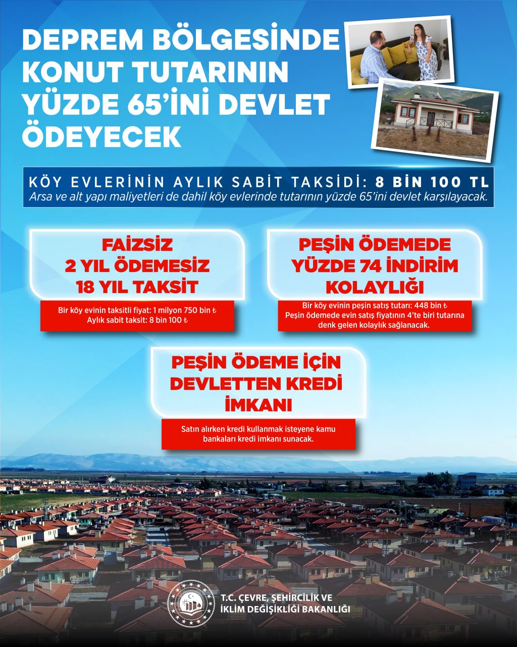 Çevre, Şehircilik ve İklim Değişikliği Bakanlığı koordinasyonunda inşa edilen afet konutlarının ödeme detayları netleşti. Devlet, toplam maliyetin büyük bölümünü üstlenirken hak sahiplerine faizsiz ve uzun vadeli ödeme imkanı sağlanacak. Peşin alımlarda yüksek oranlı indirim uygulanacak, kamu bankaları kredi desteği sunacak.
