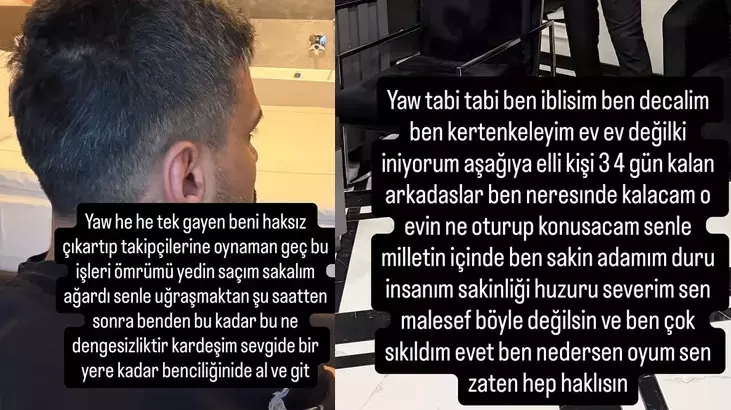 "Seninle yollarımızı ayırma kararı aldım. Bu kez kesin aldım! Sizin aile, sen hepiniz komple bensiz daha mutlu olursunuz diye düşünüyordum zaten. Ben neyim ki, kimim ki... Biz zarar ziyanız. Ben hassas ve sevgi, aşk insanıyım. Sevgi, ilgi seviyorum. Sen beni anlamıyorsun, ben anlatmaya çalışıyorum. Ne yaparsanız yapın benden sonra... Seninle yollarımız bugünden sonra ayrılıyor. Sana o laf taşıyana da selam söyle, seni arkadan doldurana da ayrıca selam söyle."
