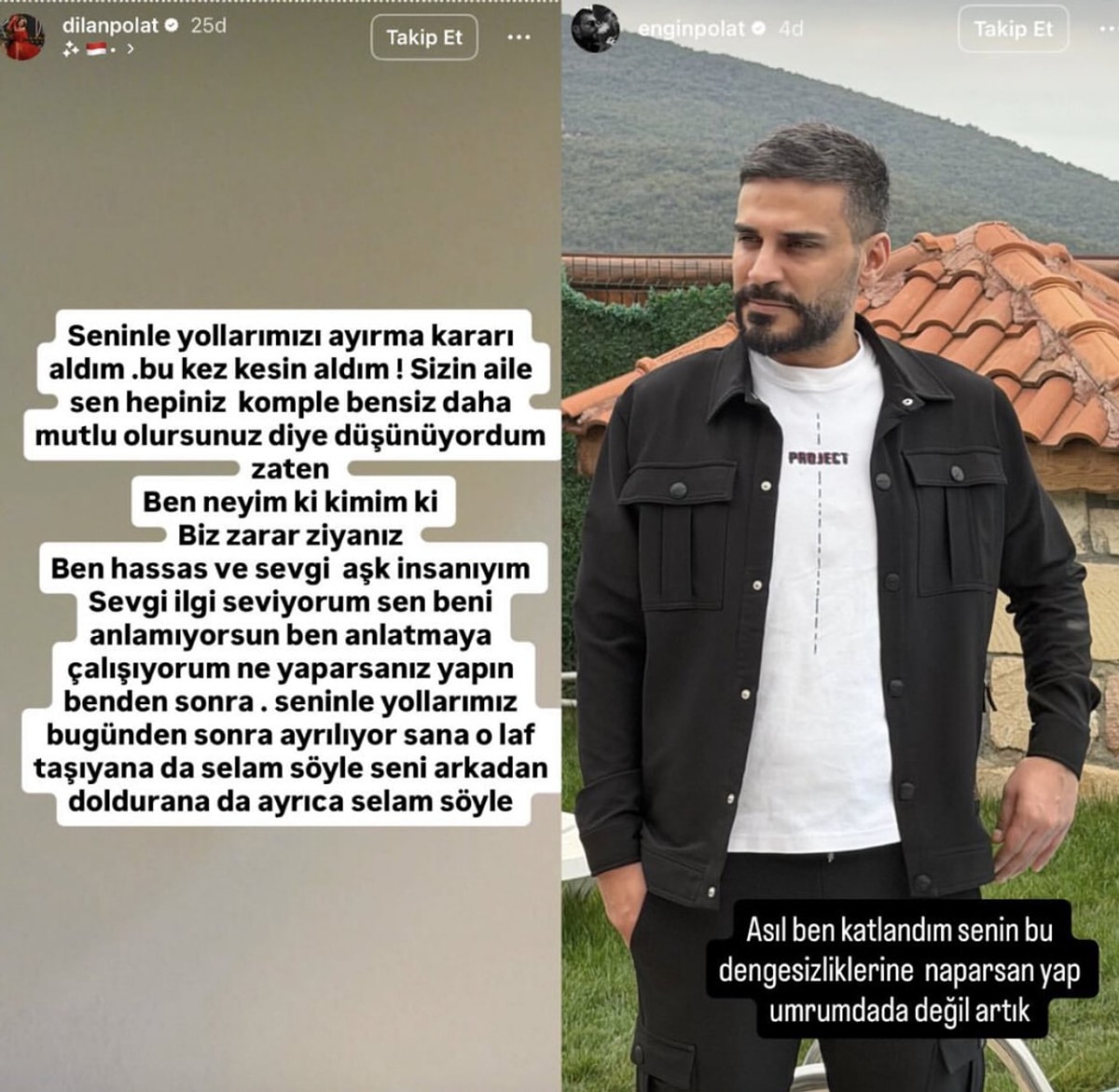 "Kara para aklama" davasıyla uzun süre gündemden düşmeyen Dilan-Engin Polat çifti, boşanma iddialarıyla gündeme geldi. Dilan Polat'ın "Yolları ayırıyoruz" restine, Engin Polat'ın "Ömrümü yedin" çıkışıyla yanıt vermesi magazin gündemini sallarken; ikilinin özel hayatlarındaki krizi tüm detaylarıyla Instagram hikayelerine taşıması, "Gerçek bir ayrılık mı yoksa yeni bir takipçi oyunu mu?" sorusunu akıllara getirdi.
