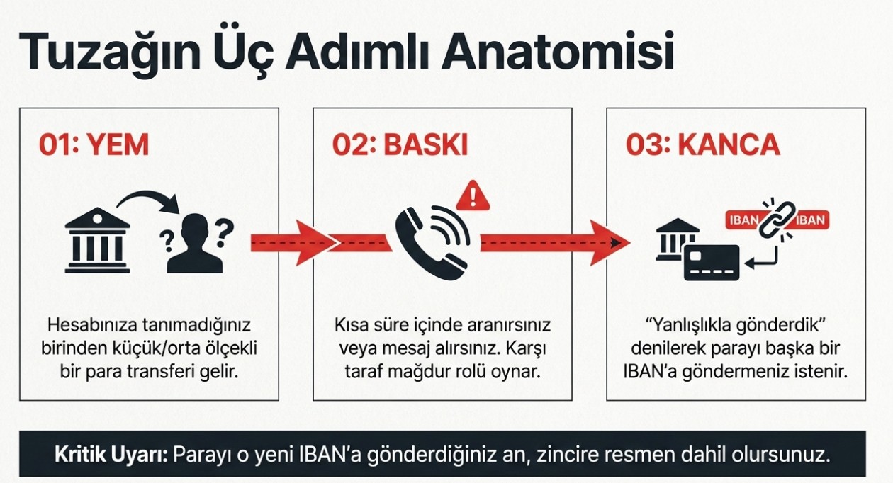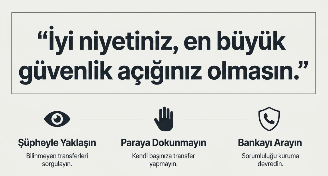 Hesabınıza tanımadığınız bir kişiden para geldiyse, ilk refleksiniz "geri göndermek" olmasın. Uzmanlara göre bu durum basit bir hata değil, sizi farkında olmadan bir dolandırıcılık zincirine dahil edebilecek kritik bir tuzak olabilir. Böyle bir durumda yapılması gereken tek şey, paraya dokunmadan bankaya bildirimde bulunmak.