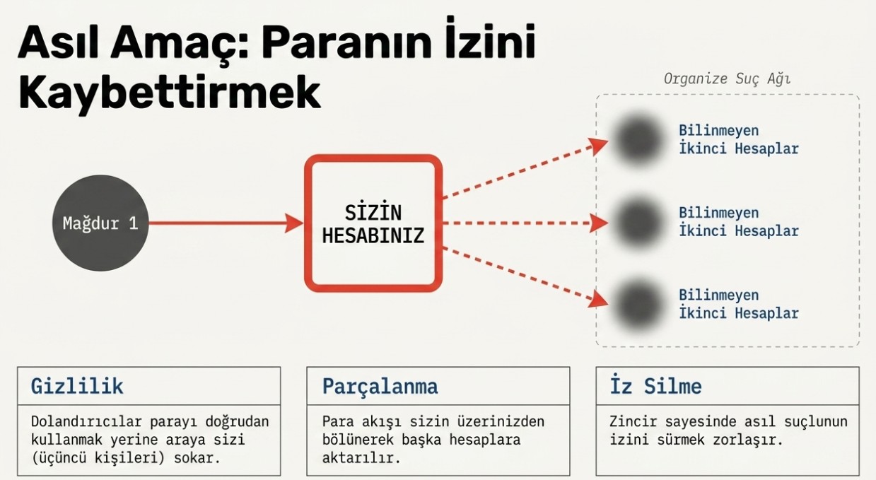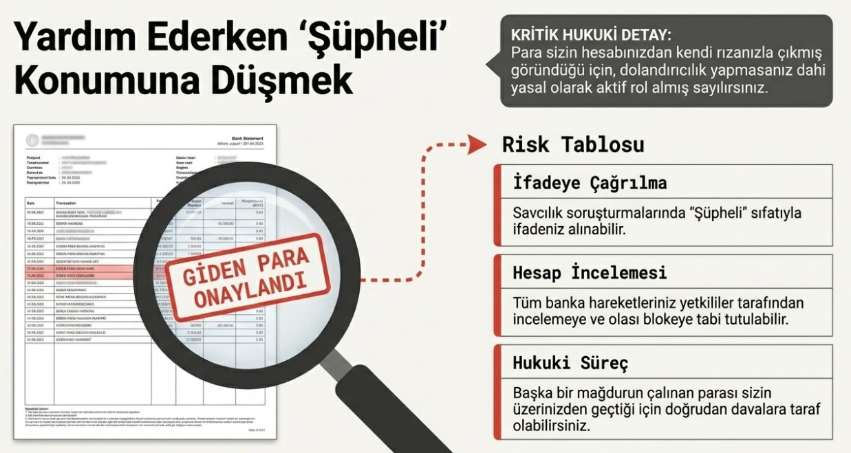 Bu yöntemin en tehlikeli tarafı, dolandırıcılık yapmayan kişilerin bile hukuki sürecin içine çekilebilmesi. Siz sadece "yardım ettiğinizi" düşünürken, yapılan transfer nedeniyle soruşturmalarda adınız geçebilir.