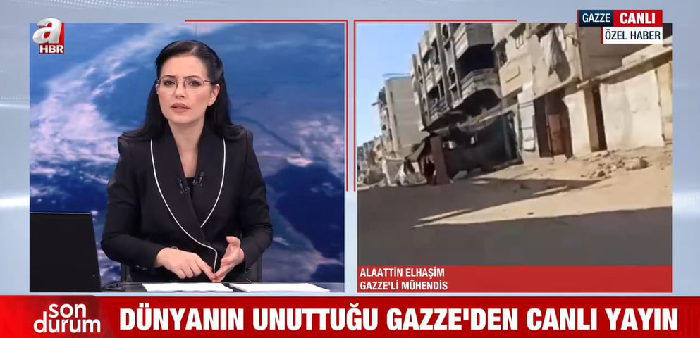 Dünyanın unuttuğu Gazze'den detayları Gazzeli mühendis Alaaddin Elhaşim A Haber canlı yayınında aktardı. A Haber'in KJ'si "Dünyanın unuttuğu Gazze'den canlı yayın" , "İşte terör devleti İsrail'in vurduğu Gazze" ifadeleri bir kez daha takdir topladı.
