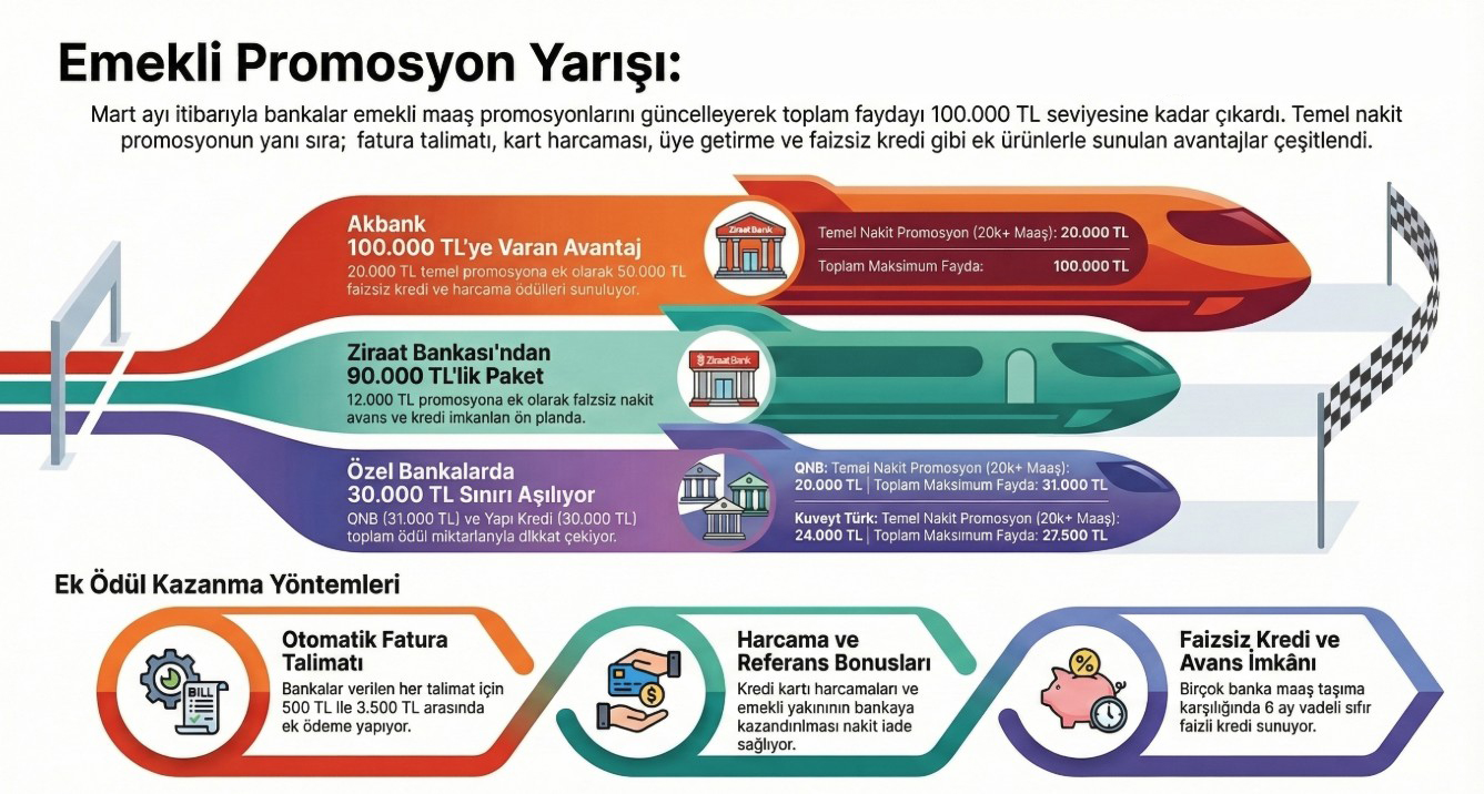 Emeklilere yönelik banka promosyonlarında rekabet her geçen gün artıyor. Mart ayı itibarıyla bankalar emekli maaşını kendi bünyesine taşımak isteyen vatandaşlara sundukları kampanyaları genişletirken, sağlanan toplam avantaj tutarı da dikkat çekici seviyelere ulaştı.