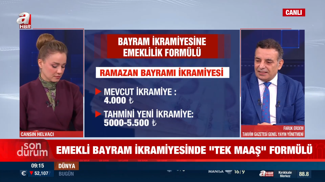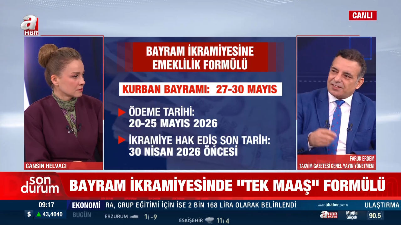 Takvim Gazetesi Genel Yayın Yönetmeni Faruk Erdem, A Haber canlı yayınında milyonlarca emeklinin merakla beklediği bayram ikramiyelerine ilişkin hem rakam hem de takvim açısından kritik bilgiler paylaştı. Özellikle yeni emekli olacak vatandaşları yakından ilgilendiren açıklamalar, ikramiyeden kimlerin yararlanabileceğini netleştirdi.