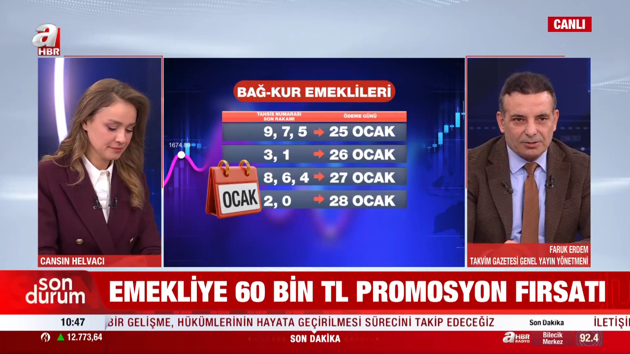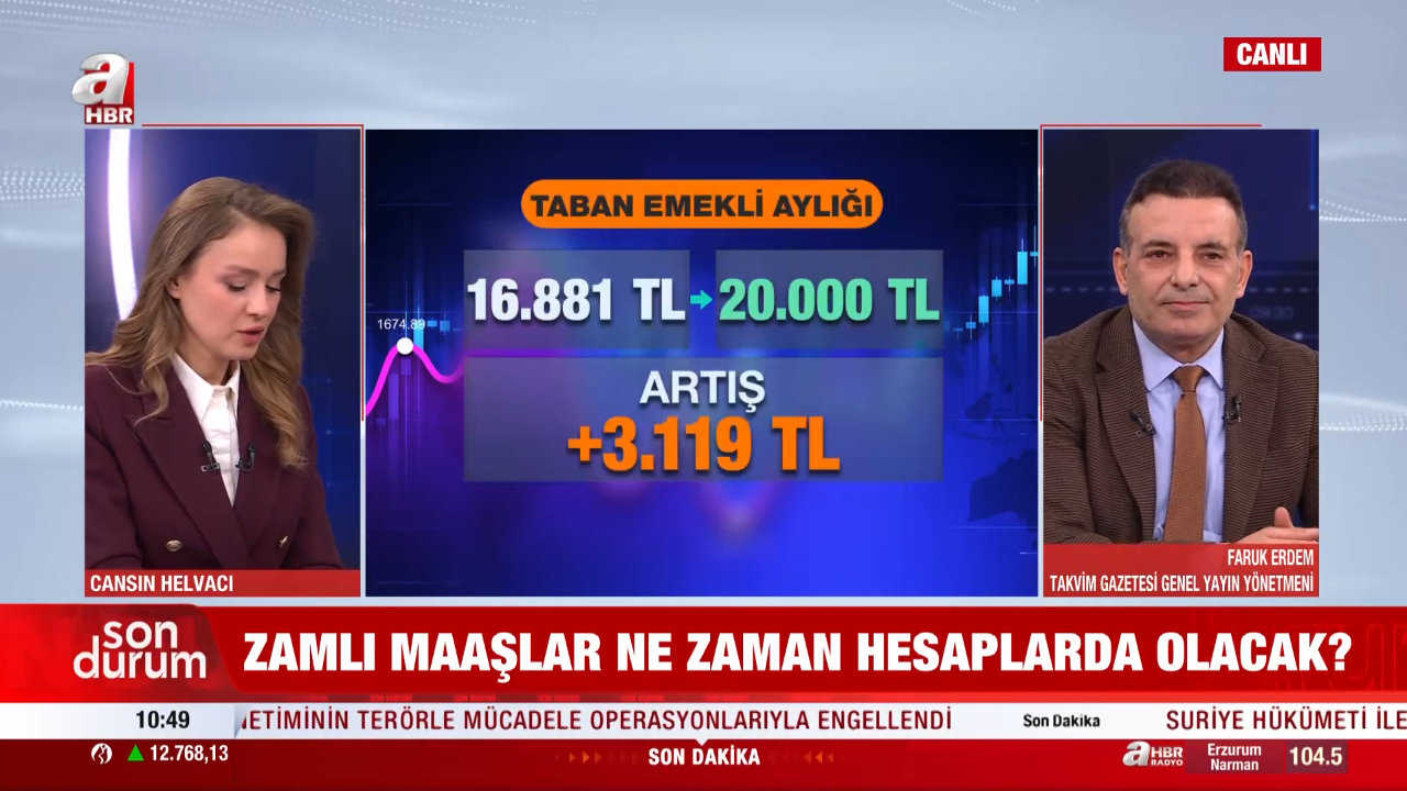 A Haber ekranlarında canlı yayına katılan Takvim Gazetesi Genel Yayın Yönetmeni Faruk Erdem, emekli maaşlarına yapılan zamlar, ödeme tarihleri ve en düşük emekli aylığına ilişkin detayları paylaştı.