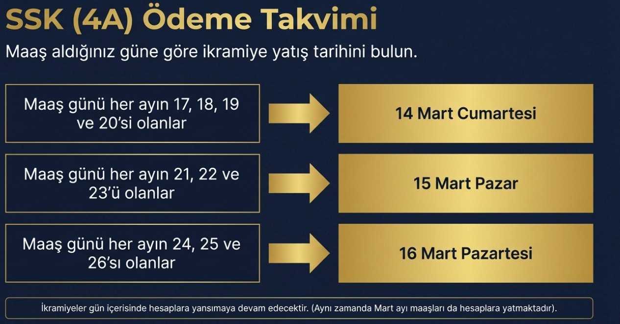 - Ödeme günü ayın 27 ve 28'i olan Bağ-Kur emeklileri ise ikramiyelerini 18 Mart Çarşamba günü alacak.