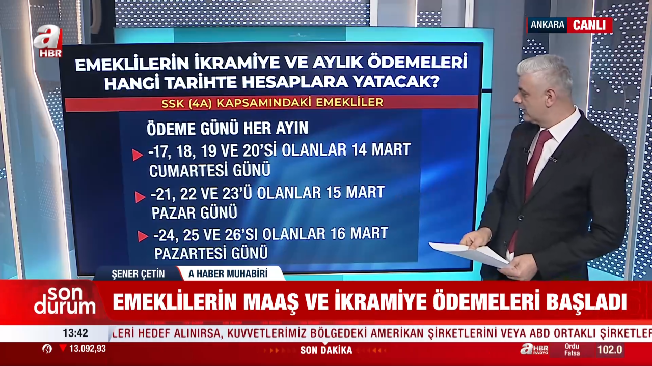 Ramazan Bayramı öncesinde emeklilere yapılacak maaş ve bayram ikramiyesi ödemeleri başladı. A Haber muhabirinin Ankara'dan canlı yayında aktardığı bilgilere göre, SSK, Bağ-Kur ve Emekli Sandığı kapsamındaki milyonlarca emeklinin 4 bin liralık bayram ikramiyesi ve mart ayı maaşları belirlenen takvim doğrultusunda 14 Mart itibarıyla hesaplara yatırılmaya başladı ve ödemeler gün gün devam edecek.