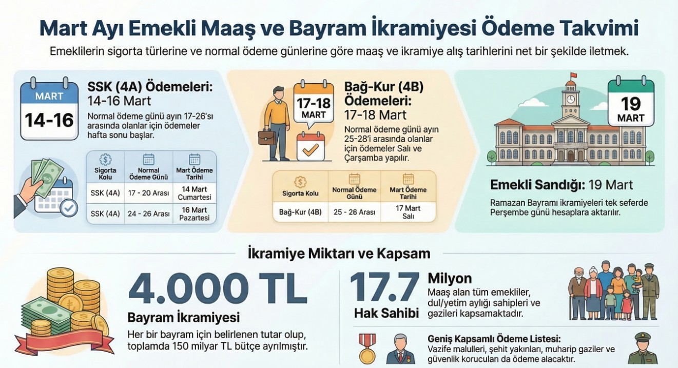 - Maaş ödeme günü ayın 17, 18, 19 ve 20'si olan emekliler, 14 Mart Cumartesi günü itibarıyla hem Mart ayı maaşlarını hem de Ramazan Bayramı ikramiyelerini almaya başladı.